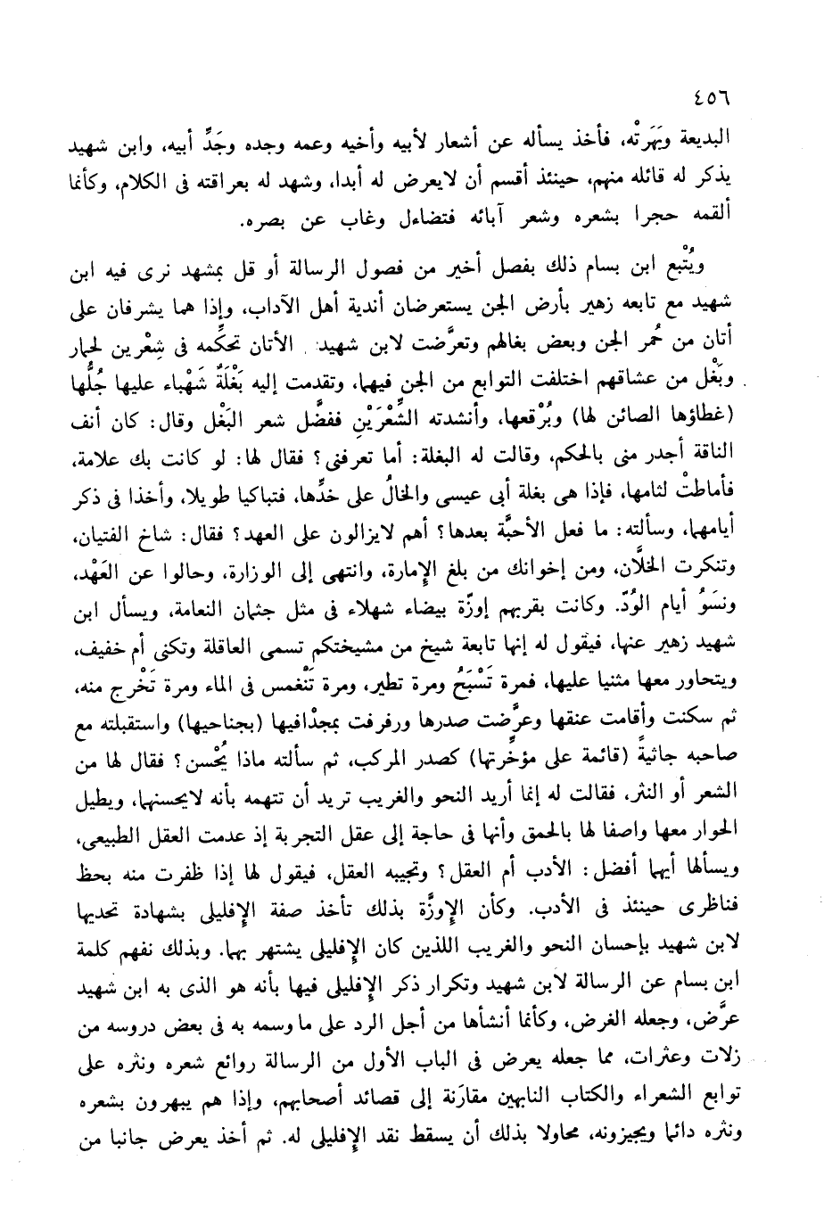ويتبع ابن بسام ذلك بفصل أخير من فصول الرسالة أو قل بمشهد نرى فيه ابن شهيد مع تابعه زهير بأرض الجن يستعرضان أندية أهل الآداب، وإذا هما يشرفان على أتان من حمر الجن وبعض بغالهم وتعرّضت لابن شهيد الأتان تحكّمه فى شعرين لحمار وبغل من عشاقهم اختلفت التوابع من الجن فيهما، وتقدمت إليه بغلة شهباء عليها جلّها (غطاؤها الصائن لها) وبرقعها، وأنشدته الشّعرين ففضّل شعر البغل وقال: كان أنف الناقة أجدر منى بالحكم، وقالت له البغلة: أما تعرفنى؟ فقال لها: لو كانت بك علامة، فأماطت لثامها، فإذا هى بغلة أبى عيسى والخال على خدّها، فتباكيا طويلا، وأخذا فى ذكر أيامهما، وسألته: ما فعل الأحبّة بعدها؟ أهم لا يزالون على العهد؟ فقال: شاخ الفتيان، وتنكرت الخلاّن، ومن إخوانك من بلغ الإمارة، وانتهى إلى الوزارة، وحالوا عن العهد، ونسو أيام الودّ. وكانت بقربهم إوزّة بيضاء شهلاء فى مثل جثمان النعامة، ويسأل ابن شهيد زهير عنها، فيقول له إنها تابعة شيخ من مشيختكم تسمى العاقلة وتكنى أم خفيف، ويتحاور معها مثنيا عليها، فمرة تسبح ومرة تطير، ومرة تنغمس فى الماء ومرة تخرج منه، ثم سكنت وأقامت عنقها وعرّضت صدرها ورفرفت بمجدا فيها (بجناحيها) واستقبلته مع صاحبه جاثية (قائمة على مؤخّرتها) كصدر المركب، ثم سألته ماذا يحسن؟ فقال لها من الشعر أو النثر، فقالت له إنما أريد النحو والغريب تريد أن تتهمه بأنه لا يحسنهما، ويطيل الحوار معها واصفا لها بالحمق وأنها فى حاجة إلى عقل التجربة إذ عدمت العقل الطبيعى، ويسألها أيهما أفضل: الأدب أم العقل؟ وتجيبه العقل، فيقول لها إذا ظفرت منه بحظ فناظرى حينئذ فى الأدب. وكأن الإوزّة بذلك تأخذ صفة الإفليلى بشهادة تحديها لابن شهيد بإحسان النحو والغريب اللذين كان الإفليلى يشتهر بهما. وبذلك نفهم كلمة ابن بسام عن الرسالة لابن شهيد وتكرار ذكر الإفليلى فيها بأنه هو الذى به ابن شهيد عرّض، وجعله الغرض، وكأنما أنشأها من أجل الرد على ما وسمه به فى بعض دروسه من زلات وعثرات، مما جعله يعرض فى الباب الأول من الرسالة روائع شعره ونثره على توابع الشعراء والكتاب النابهين مقارنة إلى قصائد أصحابهم، وإذا هم يبهرون بشعره ونثره دائما ويجيزونه، محاولا بذلك أن يسقط نقد الإفليلى له. ثم أخذ يعرض جانبا من