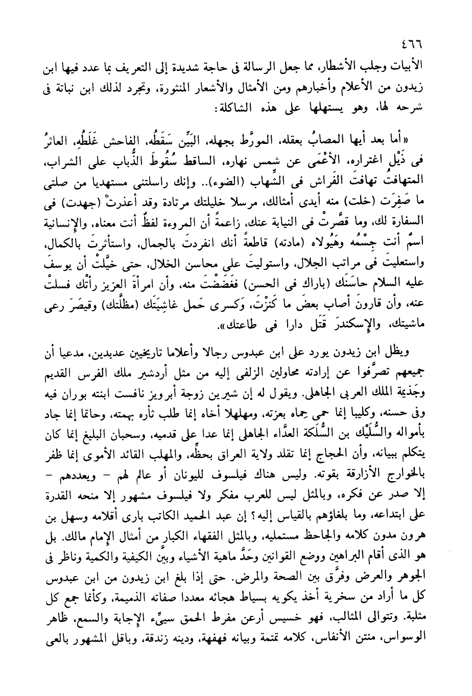 «أما بعد أيها المصاب بعقله، المورّط بجهله، البيّن سقطه، الفاحش غلطه، العاثر فى ذيل اغتراره، الأعمى عن شمس نهاره، الساقط سقوط الذّباب على الشراب، المتهافت تهافت الفراش فى الشّهاب (الضوء). . وإنك راسلتنى مستهديا من صلتى ما صفرت (خلت) منه أيدى أمثالك، مرسلا خليلتك مرتادة وقد أعذرت (جهدت) فى السفارة لك، وما قصّرت فى النيابة عنك، زاعمة أن المروءة لفظ أنت معناه، والإنسانية اسم أنت جسمه وهيولاه (مادته) قاطعة أنك انفردت بالجمال، واستأثرت بالكمال، واستعليت فى مراتب الجلال، واستوليت على محاسن الخلال، حتى خيّلت أن يوسف عليه السلام حاسنك (باراك فى الحسن) فغضضت منه، وأن امرأة العزيز رأتك فسلت عنه، وأن قارون أصاب بعض ما كنزت، وكسرى حمل غاشيتك (مظلّتك) وقيصر رعى ماشيتك، والإسكندر قتل دارا فى طاعتك».