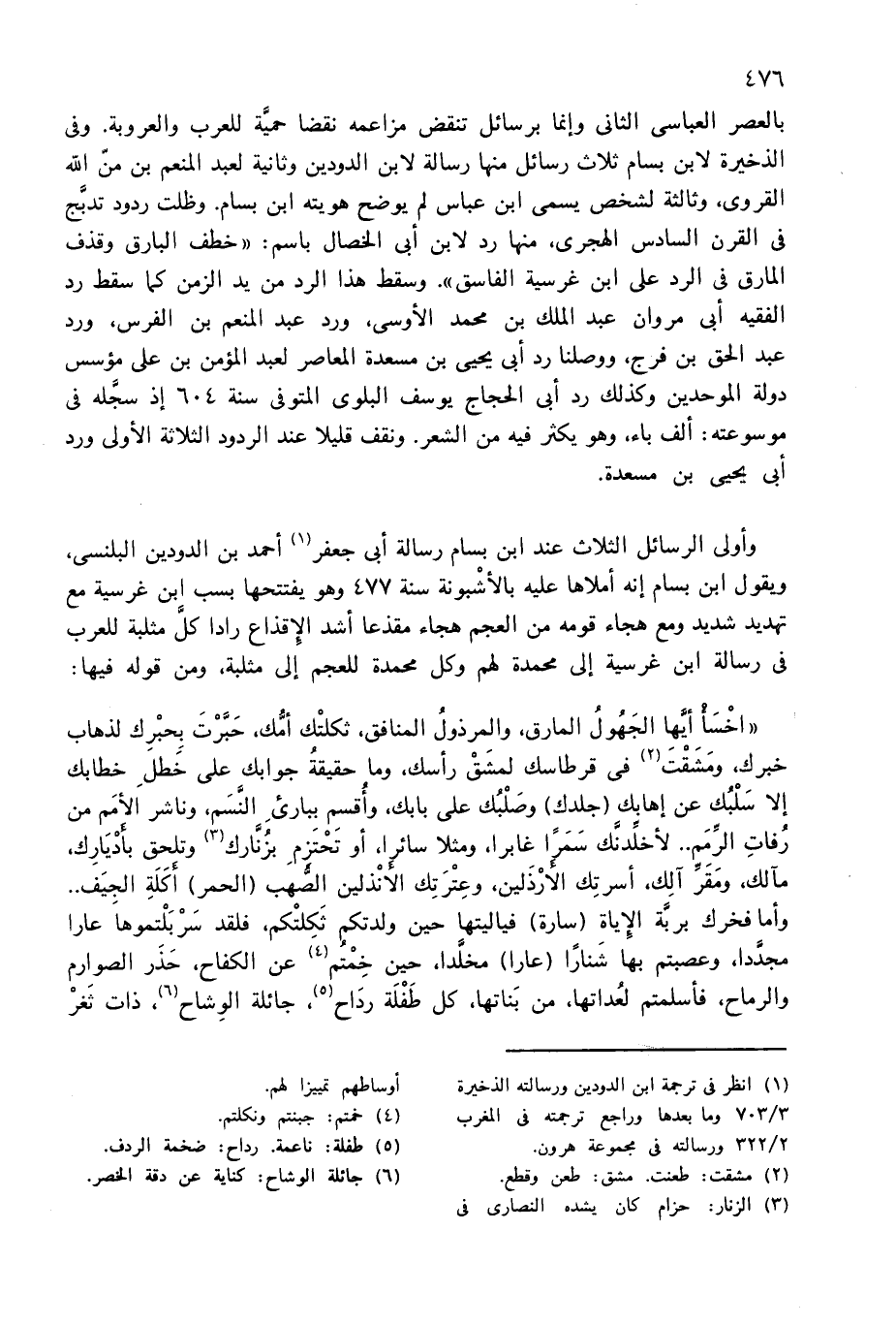 وأولى الرسائل الثلاث عند ابن بسام رسالة أبى جعفر (¬1) أحمد بن الدودين البلنسى، ويقول ابن بسام إنه أملاها عليه بالأشبونة سنة 477 وهو يفتتحها بسب ابن غرسية مع تهديد شديد ومع هجاء قومه من العجم هجاء مقذعا أشد الإقذاع رادا كلّ مثلبة للعرب فى رسالة ابن غرسية إلى محمدة لهم وكل محمدة للعجم إلى مثلبة، ومن قوله فيها: