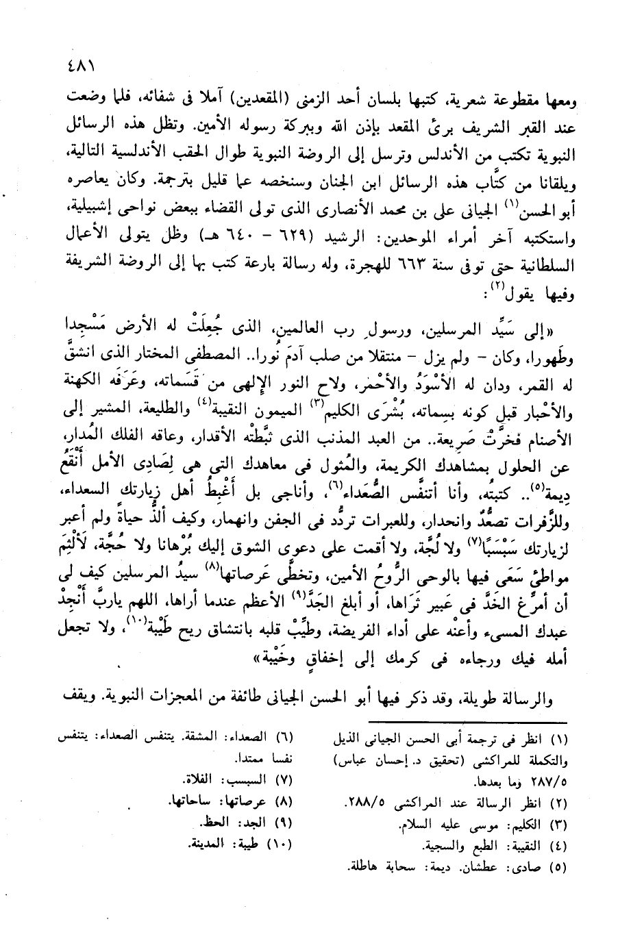 ومعها مقطوعة شعرية، كتبها بلسان أحد الزمنى (المقعدين) آملا فى شفائه، فلما وضعت عند القبر الشريف برئ المقعد بإذن الله وببركة رسوله الأمين. وتظل هذه الرسائل النبوية تكتب من الأندلس وترسل إلى الروضة النبوية طوال الحقب الأندلسية التالية، ويلقانا من كتّاب هذه الرسائل ابن الجنان وسنخصه عما قليل بترجمة. وكان يعاصره أبو الحسن (¬1) الجيانى على بن محمد الأنصارى الذى تولى القضاء ببعض نواحى إشبيلية، واستكتبه آخر أمراء الموحدين: الرشيد (629 - 640 هـ) وظل يتولى الأعمال السلطانية حتى توفى سنة 663 للهجرة، وله رسالة بارعة كتب بها إلى الروضة الشريفة وفيها يقول (¬2):