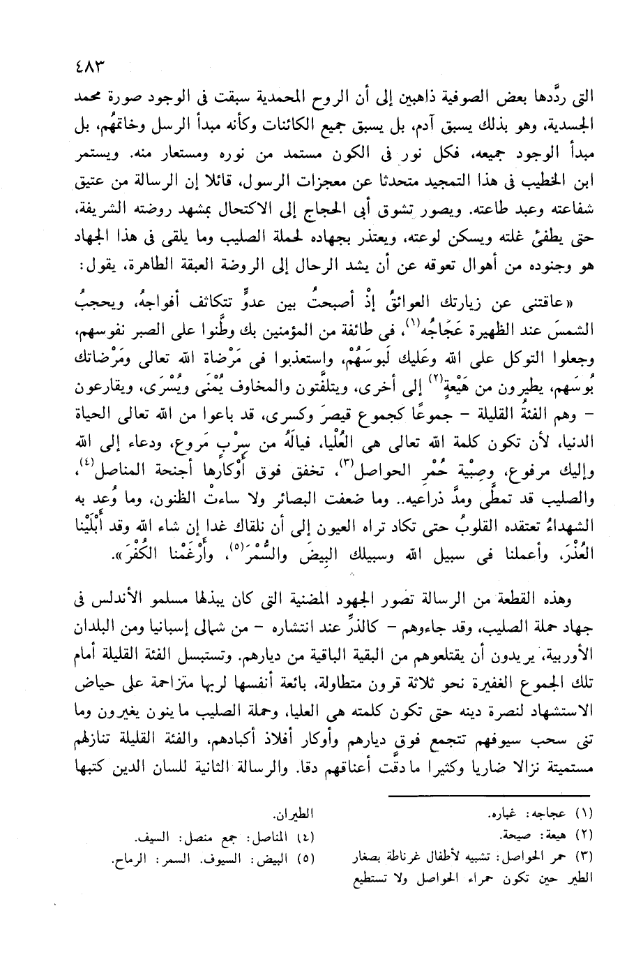 وهذه القطعة من الرسالة تصور الجهود المضنية التى كان يبذلها مسلمو الأندلس فى جهاد حملة الصليب، وقد جاءوهم-كالذرّ عند انتشاره-من شمالى إسبانيا ومن البلدان الأوربية، يريدون أن يقتلعوهم من البقية الباقية من ديارهم. وتستبسل الفئة القليلة أمام تلك الجموع الغفيرة نحو ثلاثة قرون متطاولة، بائعة أنفسها لربها متزاحمة على حياض الاستشهاد لنصرة دينه حتى تكون كلمته هى العليا، وحملة الصليب ما ينون يغيرون وما تنى سحب سيوفهم تتجمع فوق ديارهم وأوكار أفلاذ أكبادهم، والفئة القليلة تنازلهم مستميتة نزالا ضاريا وكثيرا ما دقّت أعناقهم دقا. والرسالة الثانية للسان الدين كتبها