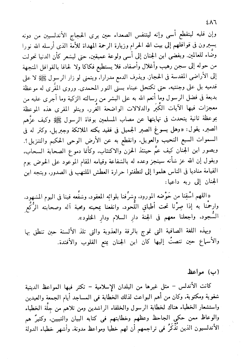 وإن قلبه ليتقطع أسى وإنه ليتنفس الصعداء حين يرى الحجاج الأندلسيين من دونه يسيرون فى قوافلهم إلى بيت الله الحرام وزيارة الرحمة المهداة للأمة الذى أرسله الله نورا وضّاء للعالمين. ويفضى ابن الجنان إلى أسى ولوعة عميقين، حتى ليشعر كأن الدنيا تحولت من حوله إلى سجن رهيب وأغلال وأصفاد، فلا يستطيع فكاكا ولا لحاقا بالقوافل المتجهة إلى الأراضى المقدسة فى الحجاز. ويذرف الدمع مدرارا، ويتمنى لو زار الرسول صلى الله عليه وسلم لا على قدميه بل على وجنتيه، حتى تكتحل عيناه بسنى النور المحمدى. وروى المقّرى له موعظة بديعة فى فضل الرسول وما أنعم الله به على البشر من رسالته الزكية وما أجرى عليه من معجزات فيها الآيات الكبر والدلالات الواضحة الغرر، ويتلو المقرى هذه الموعظة بموعظة ثانية يتحدث فى نهايتها عن مصاب المسلمين بوفاة الرسول صلى الله عليه وسلم وكيف عزّهم الصبر، يقول: «وهل يسوغ الصبر الجميل فى فقيد بكته الملائكة وجبريل، وكثر له فى السموات السبع النحيب والعويل، وانقطع به عن الأرض الوحى الحكيم والتنزيل؟ .