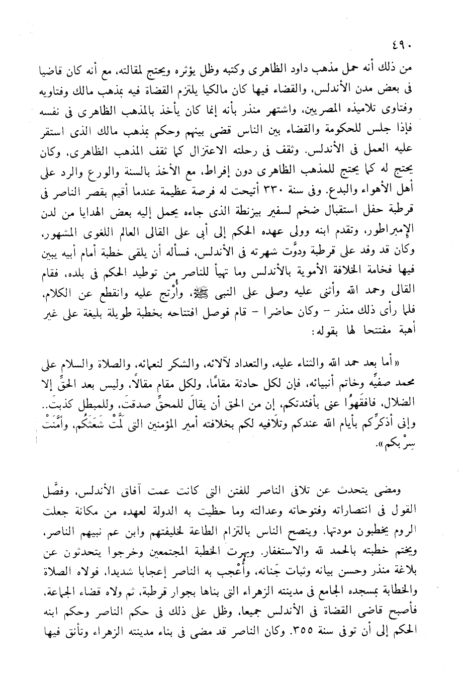 ومضى يتحدث عن تلافى الناصر للفتن التى كانت عمت آفاق الأندلس، وفصّل القول فى انتصاراته وفتوحاته وعدالته وما حظيت به الدولة لعهده من مكانة جعلت الروم يخطبون مودتها. وينصح الناس بالتزام الطاعة لخليفتهم وابن عم نبيهم الناصر، ويختم خطبته بالحمد لله والاستغفار. وبهرت الخطبة المجتمعين وخرجوا يتحدثون عن بلاغة منذر وحسن بيانه وثبات جنانه، وأعجب به الناصر إعجابا شديدا، فولاه الصلاة والخطابة بمسجده الجامع فى مدينته الزهراء التى بناها بجوار قرطبة، ثم ولاه قضاء الجماعة، فأصبح قاضى القضاة فى الأندلس جميعا، وظل على ذلك فى حكم الناصر وحكم ابنه الحكم إلى أن توفى سنة 355. وكان الناصر قد مضى فى بناء مدينته الزهراء وتأنق فيها