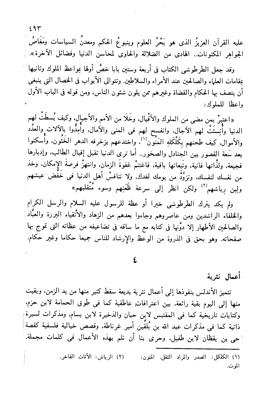 ولم يكد يترك الطرطوشى خبرا أو عظة للرسول عليه السلام والرسل الكرام والخلفاء الراشدين ومن عاصروهم وجاءوا بعدهم من الزهاد والأتقياء البررة والعبّاد والصالحين الأطهار إلا دوّنها فى كتابه مع ما ساقه فى تضاعيفه من عظاته التى تموج بها صفحاته. وهو بحق فى الذروة من الوعظ والإرشاد للناس جميعا حكاما وغير حكام.