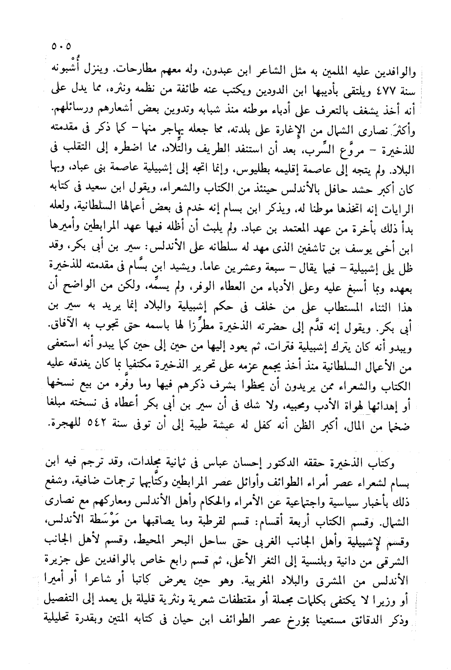 وكتاب الذخيرة حققه الدكتور إحسان عباس فى ثمانية مجلدات، وقد ترجم فيه ابن بسام لشعراء عصر أمراء الطوائف وأوائل عصر المرابطين وكتّابهما ترجمات ضافية، وشفع ذلك بأخبار سياسية واجتماعية عن الأمراء والحكام وأهل الأندلس ومعاركهم مع نصارى الشمال. وقسم الكتاب أربعة أقسام: قسم لقرطبة وما يصاقبها من موسطة الأندلس، وقسم لإشبيلية وأهل الجانب الغربى حتى ساحل البحر المحيط، وقسم لأهل الجانب الشرقى من دانية وبلنسية إلى الثغر الأعلى، ثم قسم رابع خاص بالوافدين على جزيرة الأندلس من المشرق والبلاد المغربية. وهو حين يعرض كاتبا أو شاعرا أو أميرا أو وزيرا لا يكتفى بكلمات مجملة أو مقتطفات شعرية ونثرية قليلة بل يعمد إلى التفصيل وذكر الدقائق مستعينا بمؤرخ عصر الطوائف ابن حيان فى كتابه المتين وبقدرة تحليلية