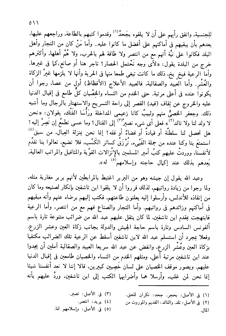 وأما الرعية فبخ بخ، ذلك ما كانت تبغى طمعا منها فى الحرية وأنها لا يلزمها غير الزكاة والعشر. وأما العبيد والصقالبة، فالعبيد الأعلاج (الأفظاظ) أول من عصا، رجوا أن يكونوا عنده فى أعلى مرتبة. حتى الخدم من النساء والخصيان كلّ طامع فى إقبال الدنيا عليه والخروج عن ثقاف (قيد) القصر إلى راحة التسريح والاستهتار بالرجال وما أشبه ذلك. وجعفر الخصىّ منهم ولبيب كانا زعيمى المداخلة ورأسا الفتك، يقولان: «نحن لا ولد لنا ولا تالد (¬2)» فعلى أى شئ نصير (¬3) إلى القتال؟ وما عسى نطمع إن نصر إليه؟ هل تحصل لنا سلطنة أو قيادة أو قضاء أو فقه؟ إنما نحن بمنزلة العيال، من سبق (¬4) استمتع بنا وكنا عنده من جملة الفيئ، نرزق كسائر الكسب، فلا نضيع، تعالوا بنا نقدّم لأنفسنا، ووردت عليهم كتب أمير المسلمين بالإنزالات القوّية والمثاقيل والمراتب العالية، يعدهم بذلك عند إكمال حاجته وإسلامهم (¬5) له».