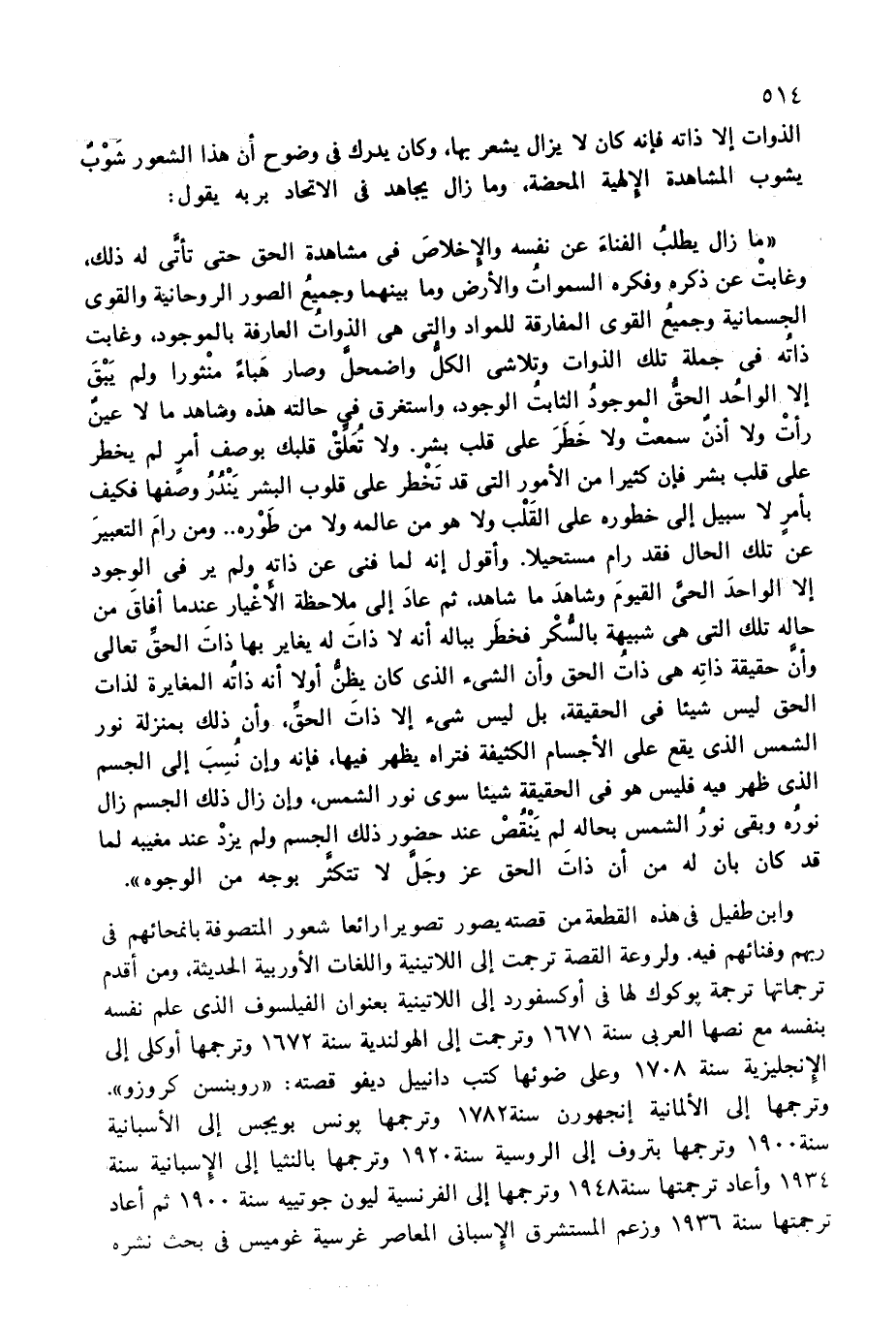 وابن طفيل فى هذه القطعة من قصته يصور تصويرا رائعا شعور المتصوفة بانمحائهم فى ربهم وفنائهم فيه. ولروعة القصة ترجمت إلى اللاتينية واللغات الأوربية الحديثة، ومن أقدم ترجماتها ترجمة بوكوك لها فى أوكسفورد إلى اللاتينية بعنوان الفيلسوف الذى علم نفسه بنفسه مع نصها العربى سنة 1671 وترجمت إلى الهولندية سنة 1672 وترجمها أوكلى إلى الإنجليزية سنة 1708 وعلى ضوئها كتب دانييل ديفو قصته: «روبنسن كروزو».