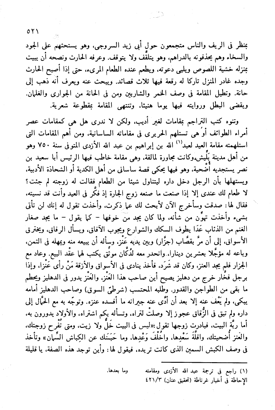 وتنوه كتب التراجم بمقامات لغير أديب، ولكن لا ندرى هل هى كمقامات عصر أمراء الطوائف أو هى تستلهم الحريرى فى مقاماته الساسانية، ومن أهم المقامات التى استلهمته مقامة العيد لعبد (¬1) الله بن إبراهيم بن عبد الله الأزدى المتوفى سنة 750 وهو من أهل مدينة بلّيش، وكانت مجاورة لمالقة، وهى مقامة خاطب فيها الرئيس أبا سعيد بن نصر يستجديه أضحية، وهو فيها يحكى قصة ساسانى من أهل الكدية أو الشحاذة الأدبية، ويستهلها بأن الرجل دخل داره ليتناول شيئا من الطعام فقالت له زوجته لم جئت؟ لا طعام لك عندى إلا إذا صنعت ما صنعه زوج الجارة إذ فكّر فى العيد وأنت قد نسيته، فقال لها: صدقت وسأخرج الآن لأبحث لك عما ذكرت، وأخذت تقول له إنك لن تأتى بشئ وأخذت تهوّن من شأنه، ولما كان يجد من خوفها-كما يقول-ما يجد صغار الغنم من الذئاب عدا يطوف السكك والشوارع ويجوب الآفاق، ويسأل الرفاق، ويخترق الأسواق، إلى أن مرّ بقصّاب (جزّار) وبين يديه عنز، وسأله أن يبيعه منه ويمهله فى الثمن، وباعه له مؤجّلا بعشرين دينارا، وانحدر معه لدكّان موثّق يكتب لهما عقد البيع. وعاد مع الجزار فلم يجد العنز، وكان قد شرد، فأخذ ينادى فى الأسواق والأزقة من رأى عنزا، وإذا برجل فخّار خرج من دهليز يصيح أين صاحب هذا العنز، والعنز يدور فى الدهليز ويحطم ما بقى من الطواجن والقدور. وطلبه المحتسب (شرطىّ السوق) وصاحب الدهليز أمامه يبكى، ولم يعف عنه إلا بعد أن أدّى عنه جيرانه ما أفسده عنزه. وتوجّه به مع الحمّال إلى داره ولم تبق فى الزّقاق عجوز إلا وصلت لتراه، وتسأله بكم اشتراه، والأولاد يدورون به، أما ربّة البيت، فبادرت زوجها تقول: «ليس فى البيت خلّ ولا زيت، ومتى تفرح زوجتك، والعنز أضحيتك، واقلّة سعدها، واخلف وعدها، وما حبسك عن الكباش السّمان» وتأخذ فى وصف الكبش السمين الذى كانت تريده، فيقول لها: وأين توجد هذه الصفة، يا قليلة