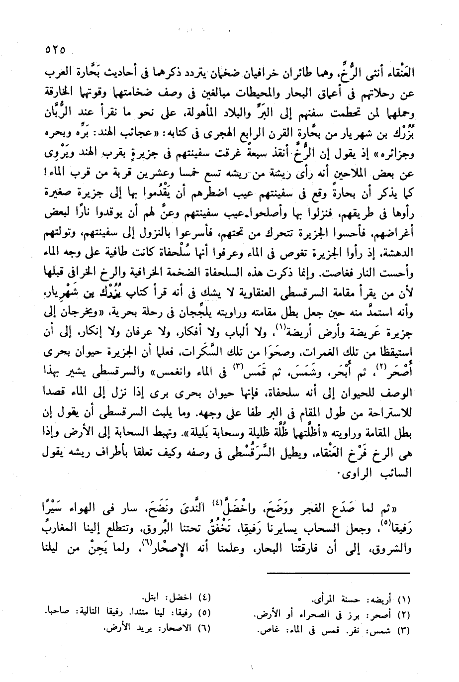 العنقاء أنثى الرّخّ، وهما طائران خرافيان ضخمان يتردد ذكرهما فى أحاديث بحّارة العرب عن رحلاتهم فى أعماق البحار والمحيطات مبالغين فى وصف ضخامتهما وقوتهما الخارقة وحملهما لمن تحطمت سفنهم إلى البرّ والبلاد المأهولة، على نحو ما نقرأ عند الرّبّان بزرك بن شهريار من بحّارة القرن الرابع الهجرى فى كتابه: «عجائب الهند: برّه وبحره وجزائره» إذ يقول إن الرّخّ أنقذ سبعة غرقت سفينتهم فى جزيرة بقرب الهند ويروى عن بعض الملاحين أنه رأى ريشة من ريشه تسع خمسا وعشرين قربة من قرب الماء! كما يذكر أن بحارة وقع فى سفينتهم عيب اضطرهم أن يقدموا بها إلى جزيرة صغيرة رأوها فى طريقهم، فنزلوا بها وأصلحوا عيب سفينتهم وعنّ لهم أن يوقدوا نارا لبعض أغراضهم، فأحسوا الجزيرة تتحرك من تحتهم، فأسرعوا بالنزول إلى سفينتهم، وتولتهم الدهشة، إذ رأوا الجزيرة تغوص فى الماء وعرفوا أنها سلحفاة كانت طافية على وجه الماء وأحست النار فغاصت. وإنما ذكرت هذه السلحفاة الضخمة الخرافية والرخ الخرافى قبلها لأن من يقرأ مقامة السرقسطى العنقاوية لا يشك فى أنه قرأ كتاب بزرك بن شهريار، وأنه استمدّ منه حين جعل بطل مقامته وراويته يلجّجان فى رحلة بحرية، «ويخرجان إلى جزيرة عريضة وأرض أريضة (¬1)، ولا ألباب ولا أفكار، ولا عرفان ولا إنكار، إلى أن استيقظا من تلك الغمرات، وصحوا من تلك السّكرات، فعلما أن الجزيرة حيوان بحرى أصحر (¬2)، ثم أبحر، وشمس، ثم قمس (¬3) فى الماء وانغمس» والسرقسطى يشير بهذا الوصف للحيوان إلى أنه سلحفاة، فإنها حيوان بحرى برى إذا نزل إلى الماء قصدا للاستراحة من طول المقام فى البر طفا على وجهه. وما يلبث السرقسطى أن يقول إن بطل المقامة وراويته «أظلّتهما ظلّة ظليلة وسجابة بليلة». وتهبط السحابة إلى الأرض وإذا هى الرخ فرخ العنقاء، ويطيل السّرقسطى فى وصفه وكيف تعلقا بأطراف ريشه يقول السائب الراوى.