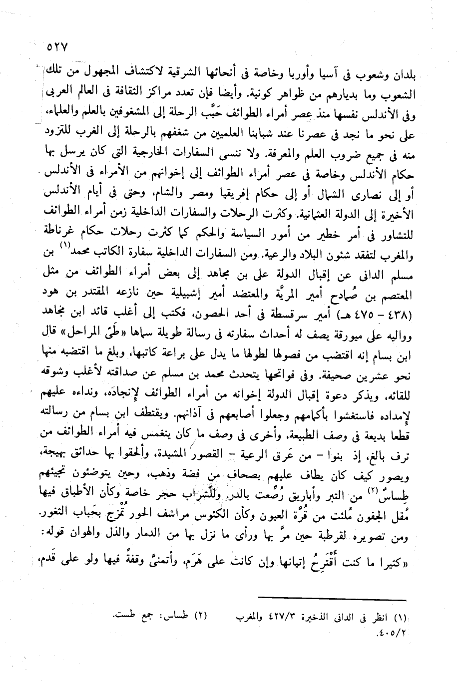 بلدان وشعوب فى آسيا وأوربا وخاصة فى أنحائها الشرقية لاكتشاف المجهول من تلك الشعوب وما بديارهم من ظواهر كونية. وأيضا فإن تعدد مراكز الثقافة فى العالم العربى وفى الأندلس نفسها منذ عصر أمراء الطوائف حبّب الرحلة إلى المشغوفين بالعلم والعلماء، على نحو ما نجد فى عصرنا عند شبابنا العلميين من شغفهم بالرحلة إلى الغرب للتزود منه فى جميع ضروب العلم والمعرفة. ولا ننسى السفارات الخارجية التى كان يرسل بها حكام الأندلس وخاصة فى عصر أمراء الطوائف إلى إخوانهم من الأمراء فى الأندلس أو إلى نصارى الشمال أو إلى حكام إفريقيا ومصر والشام، وحتى فى أيام الأندلس الأخيرة إلى الدولة العثمانية. وكثرت الرحلات والسفارات الداخلية زمن أمراء الطوائف للتشاور فى أمر خطير من أمور السياسة والحكم كما كثرت رحلات حكام غرناطة والمغرب لتفقد شئون البلاد والرعية. ومن السفارات الداخلية سفارة الكاتب محمد (¬1) بن مسلم الدانى عن إقبال الدولة على بن مجاهد إلى بعض أمراء الطوائف من مثل المعتصم بن صمادح أمير المريّة والمعتضد أمير إشبيلية حين نازعه المقتدر بن هود (438 - 475 هـ) أمير سرقسطة فى أحد الحصون، فكتب إلى أغلب قائد ابن مجاهد وواليه على ميورقة يصف له أحداث سفارته فى رسالة طويلة سماها «طىّ المراحل» قال ابن بسام إنه اقتضب من فصولها لطولها ما يدل على براعة كاتبها، وبلغ ما اقتضبه منها نحو عشرين صحيفة. وفى فواتحها يتحدث محمد بن مسلم عن صداقته لأغلب وشوقه للقائه، ويذكر دعوة إقبال الدولة إخوانه من أمراء الطوائف لإنجاده، ونداءه عليهم لإمداده فاستغشوا بأكمامهم وجعلوا أصابعهم فى آذانهم. ويقتطف ابن بسام من رسالته قطعا بديعة فى وصف الطبيعة، وأخرى فى وصف ما كان ينغمس فيه أمراء الطوائف من ترف بالغ، إذ بنوا-من عرق الرعية-القصور المشيدة، وألحقوا بها حدائق بهيجة، ويصور كيف كان يطاف عليهم بصحاف من فضة وذهب، وحين يتوضئون تجيئهم طساس (¬2) من التبر وأباريق رصّعت بالدر. وللشراب حجر خاصة وكأن الأطباق فيها مقل الجفون ملئت من قرّة العيون وكأن الكئوس مراشف الحور تمزج بحباب الثغور.
