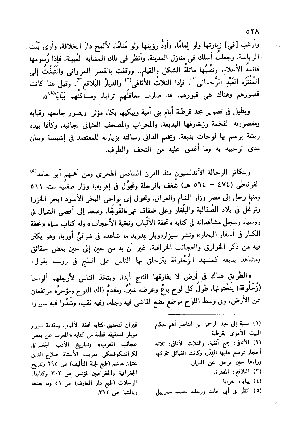 (¬5) انظر فى أبى حامد ورحلته مقدمة جبرييل قيران لتحقيق كتابه تحفة الألباب ومقدمة سيزار دوبلر لتحقيقه قطعة من كتابه «المعرب عن بعض عجائب المغرب» وتاريخ الأدب الجغرافى لكراتشكوفسكى تعريب الأستاذ صلاح الدين عثمان هاشم (طبع لجنة التأليف) ص 295 وتاريخ الجغرافية والجغرافيين لمؤنس ص 303 وكتابنا: الرحلات (طبع دار المعارف) ص 51 وما بعدها وبالنثيا ص 312.