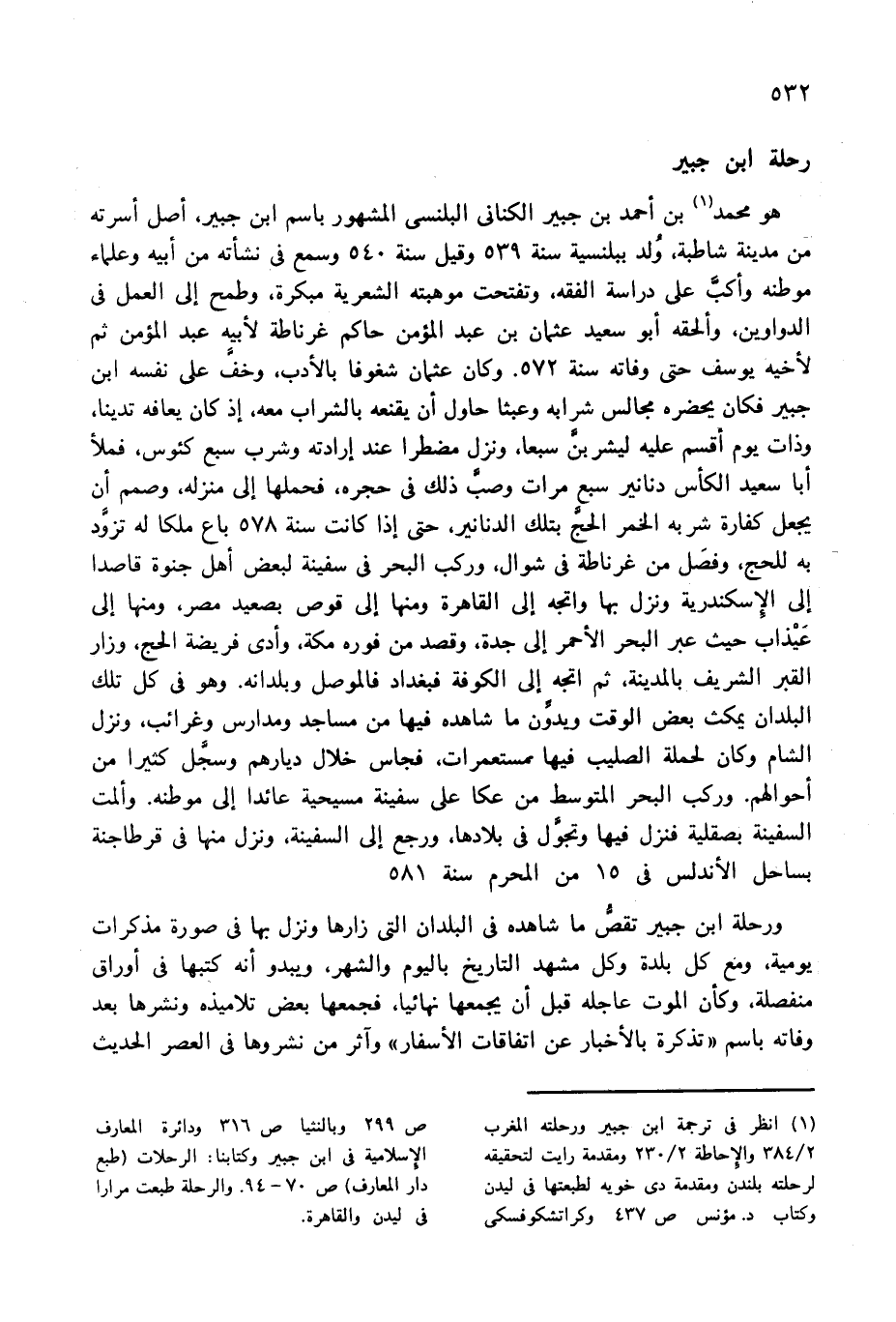 (¬1) انظر فى ترجمة ابن جبير ورحلته المغرب 2/ 384 والإحاطة 2/ 230 ومقدمة رأيت لتحقيقه لرحلته بلندن ومقدمة دى خويه لطبعتها فى ليدن وكتاب د. مؤنس ص 437 وكراتشكوفسكى ص 299 وبالنثيا ص 316 ودائرة المعارف الإسلامية فى ابن جبير وكتابنا: الرحلات (طبع دار المعارف) ص 70 - 94. والرحلة طبعت مرارا فى ليدن والقاهرة.