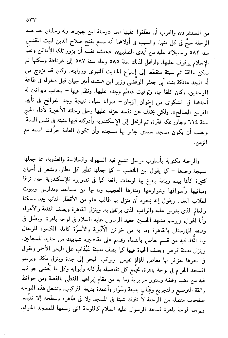 من المستشرقين والعرب أن يطلقوا عليها اسم «رحلة ابن جبير». وله رحلتان بعد هذه الرحلة حجّ فى كل منهما، والسبب فى أولاهما أنه سمع بفتح صلاح الدين لبيت المقدس سنة 582 واستيلائه عليه من أيدى الصليبيين، فحدثته نفسه أن يزور تلك الأماكن وعلم الإسلام يرفرف عليها، وارتحل لذلك سنة 585 وعاد سنة 587 إلى غرناطة وسكنها ثم سكن مالقة ثم سبتة منقطعا إلى إسماع الحديث النبوى وروايته. وكان قد تزوج من أم المجد عاتكة بنت أبى جعفر الوقّشى وزير ابن همشك أمير جيان قبل دخوله فى طاعة الموحدين، وكان كلفا بها، وتوفيت فعظم وجده عليها، ونظم فيها-بجانب ديوانين له أحدهما فى الشكوى من إخوان الزمان-ديوانا سماه: نتيجة وجد الجوانح فى تأبين القرين الصالح». ولكى يخفّف عن نفسه حزنه عليها رحل رحلته الأخيرة لأداء الحج سنة 614 وجاور بمكة فترة، ثم ارتحل إلى الإسكندرية وأدركته فيها منيته فى نفس السنة، ويغلب أن يكون مسجد سيدى جابر بها مسجده وأن تكون العامة حرّفت اسمه مع الزمن.
