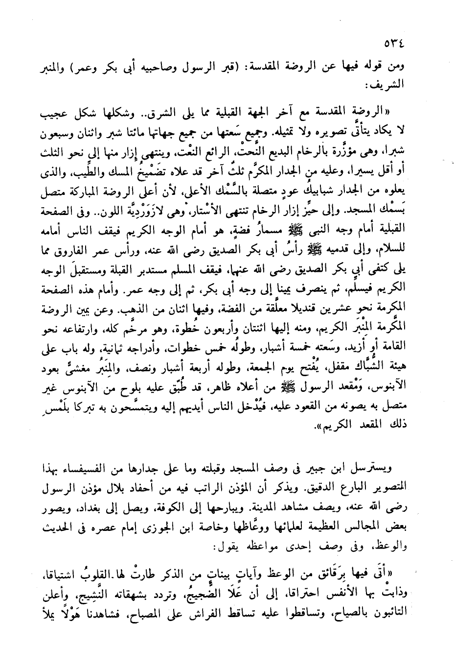 ويسترسل ابن جبير فى وصف المسجد وقبلته وما على جدارها من الفسيفساء بهذا التصوير البارع الدقيق. ويذكر أن المؤذن الراتب فيه من أحفاد بلال مؤذن الرسول رضى الله عنه، ويصف مشاهد المدينة. ويبارحها إلى الكوفة، ويصل إلى بغداد، ويصور بعض المجالس العظيمة لعلمائها ووعّاظها وخاصة ابن الجوزى إمام عصره فى الحديث والوعظ وفى وصف إحدى مواعظه يقول:
