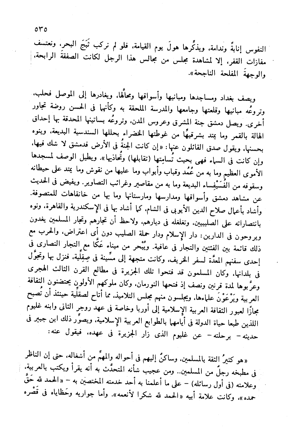 ويصف بغداد ومساجدها ومبانيها وأسواقها ومحالّها، ويغادرها إلى الموصل فحلب، وتروعه مبانيها وقلعتها وجامعها والمدرسة الملحقة به وكأنهما فى الحسن روضة تجاور أخرى. ويصل دمشق جنة المشرق وعروس المدن، وتروعه بساتينها المحدقة بها إحداق الهالة بالقمر وما يمتد بشرقيهّا من غوطتها الخضراء بحللها السندسية البديعة، وينوه بحسنها، ويقول صدق القائلون عنها: «إن كانت الجنة فى الأرض فدمشق لا شك فيها، وإن كانت فى السماء فهى بحيث تسامتها (تقابلها) وتحاذيها». ويطيل الوصف لمسجدها الأموى العظيم وما به من عمد وقباب وأبواب وما عليها من نقوش وما يمتد على حيطانه وسقوفه من الفسيفساء البديعة وما به من مقاصير وغرائب التصاوير. ويفيض فى الحديث عن مشاهد دمشق وأسواقها ومدارسها ومارستانها وما بها من خانقاهات للمتصوفة.