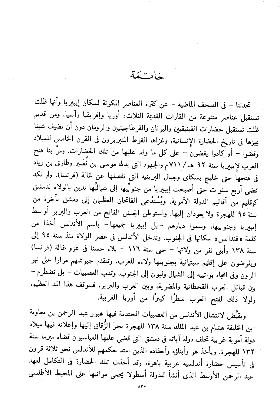 تحدثنا-فى الصحف الماضية-عن كثرة العناصر المكونة لسكان إيبيريا وأنها ظلت تستقبل عناصر متنوعة من القارات القديمة الثلاث: أوربا وإفريقيا وآسيا، ومن قديم ظلت تستقبل حضارات الفينيقيين واليونان والقرطاجينيين والرومان دون أن تضيف شيئا يميزها فى تاريخ الحضارة الإنسانية، وغزاها القوط المتبربرون فى القرن الخامس للميلاد وقضوا-أو كادوا يقضون-على كل ما وفد عليها من تلك الحضارات. ومرّ بنا فتح العرب لإيبيريا سنة 92 هـ/711 م والجهود التى بذلها موسى بن نصير وطارق بن زياد فى فتحها حتى خليج بسكاى وجبال البرينيه التى تفصلها عن غالة (فرنسا). ولم تكد تمضى أربع سنوات حتى أصبحت إيبيريا من جنوبّيها إلى شماليّها تدين بالولاء لدمشق كإقليم من أقاليم الدولة الأموية. ويستدعى الفاتحان العظيمان إلى دمشق بأخرة من سنة 95 للهجرة ولا يعودان إليها. واستوطن الجيش الفاتح من العرب والبربر أواسط إيبيريا وجنوبيها، وسموا ديارهم-بل إيبيريا جميعها-باسم الأندلس أخذا من كلمة «قندالس» سكانها فى الجنوب. وتدخل الأندلس فى عصر الولاة منذ سنة 95 إلى سنة 138 وأبلى نفر من ولاتها-حتى سنة 116 - بلاء حسنا فى غزو غالة (فرنسا) ويفرضون على إقليم؟ ؟ ؟ سبثمانية بجنوبيها ولاءه للعرب، وتتقدم جيوشهم مرارا على نهر الرون وفى اتجاه بواتييه إلى الشمال وليون إلى الجنوب، وتدب العصبيات-بل تضطرم- بين قبائل العرب القحطانية والمضرية، وبين العرب والبربر، فيتوقف هذا المد العظيم، ولولا ذلك لفتح العرب شطرا كبيرا من أوربا الغربية.