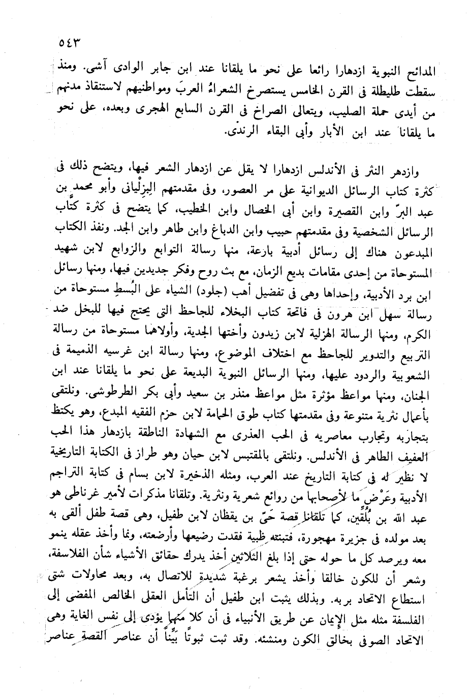 وازدهر النثر فى الأندلس ازدهارا لا يقل عن ازدهار الشعر فيها، ويتضح ذلك فى كثرة كتاب الرسائل الديوانية على مر العصور، وفى مقدمتهم البزليانى وأبو محمد بن عبد البرّ وابن القصيرة وابن أبى الخصال وابن الخطيب، كما يتضح فى كثرة كتّاب الرسائل الشخصية وفى مقدمتهم حبيب وابن الدباغ وابن طاهر وابن الجد. ونفذ الكتاب المبدعون هناك إلى رسائل أدبية بارعة، منها رسالة التوابع والزوابع لابن شهيد المستوحاة من إحدى مقامات بديع الزمان، مع بث روح وفكر جديدين فيها، ومنها رسائل ابن برد الأدبية، وإحداها وهى فى تفضيل أهب (جلود) الشياه على البسط مستوحاة من رسالة سهل ابن هرون فى فاتحة كتاب البخلاء للجاحظ التى يحتج فيها للبخل ضد الكرم، ومنها الرسالة الهزلية لابن زيدون وأختها الجدية، وأولاهما مستوحاة من رسالة التربيع والتدوير للجاحظ مع اختلاف الموضوع، ومنها رسالة ابن غرسية الذميمة فى الشعوبية والردود عليها، ومنها الرسائل النبوية البديعة على نحو ما يلقانا عند ابن الجنان، ومنها مواعظ مؤثرة مثل مواعظ منذر بن سعيد وأبى بكر الطرطوشى. ونلتقى بأعمال نثرية متنوعة وفى مقدمتها كتاب طوق الحمامة لابن حزم الفقيه المبدع، وهو يكتظ بتجاربه وتجارب معاصريه فى الحب العذرى مع الشهادة الناطقة بازدهار هذا الحب العفيف الطاهر فى الأندلس. ونلتقى بالمقتبس لابن حيان وهو طراز فى الكتابة التاريخية لا نظير له فى كتابة التاريخ عند العرب، ومثله الذخيرة لابن بسام فى كتابة التراجم الأدبية وعرض ما لأصحابها من روائع شعرية ونثرية. وتلقانا مذكرات لأمير غرناطى هو عبد الله بن بلقّين، كما تلقانا قصة حىّ بن يقظان لابن طفيل، وهى قصة طفل ألقى به بعد مولده فى جزيرة مهجورة، فتبنته ظبية فقدت رضيعها وأرضعته، ونما وأخذ عقله ينمو معه ويرصد كل ما حوله حتى إذا بلغ الثلاثين أخذ يدرك حقائق الأشياء شأن الفلاسفة، وشعر أن للكون خالقا وأخذ يشعر برغبة شديدة للاتصال به، وبعد محاولات شتى استطاع الاتحاد بربه. وبذلك يثبت ابن طفيل أن التأمل العقلى الخالص المفضى إلى الفلسفة مثله مثل الإيمان عن طريق الأنبياء فى أن كلا منهما يؤدى إلى نفس الغاية وهى الاتحاد الصوفى بخالق الكون ومنشئه. وقد ثبت ثبوتا بيّنا أن عناصر القصة عناصر