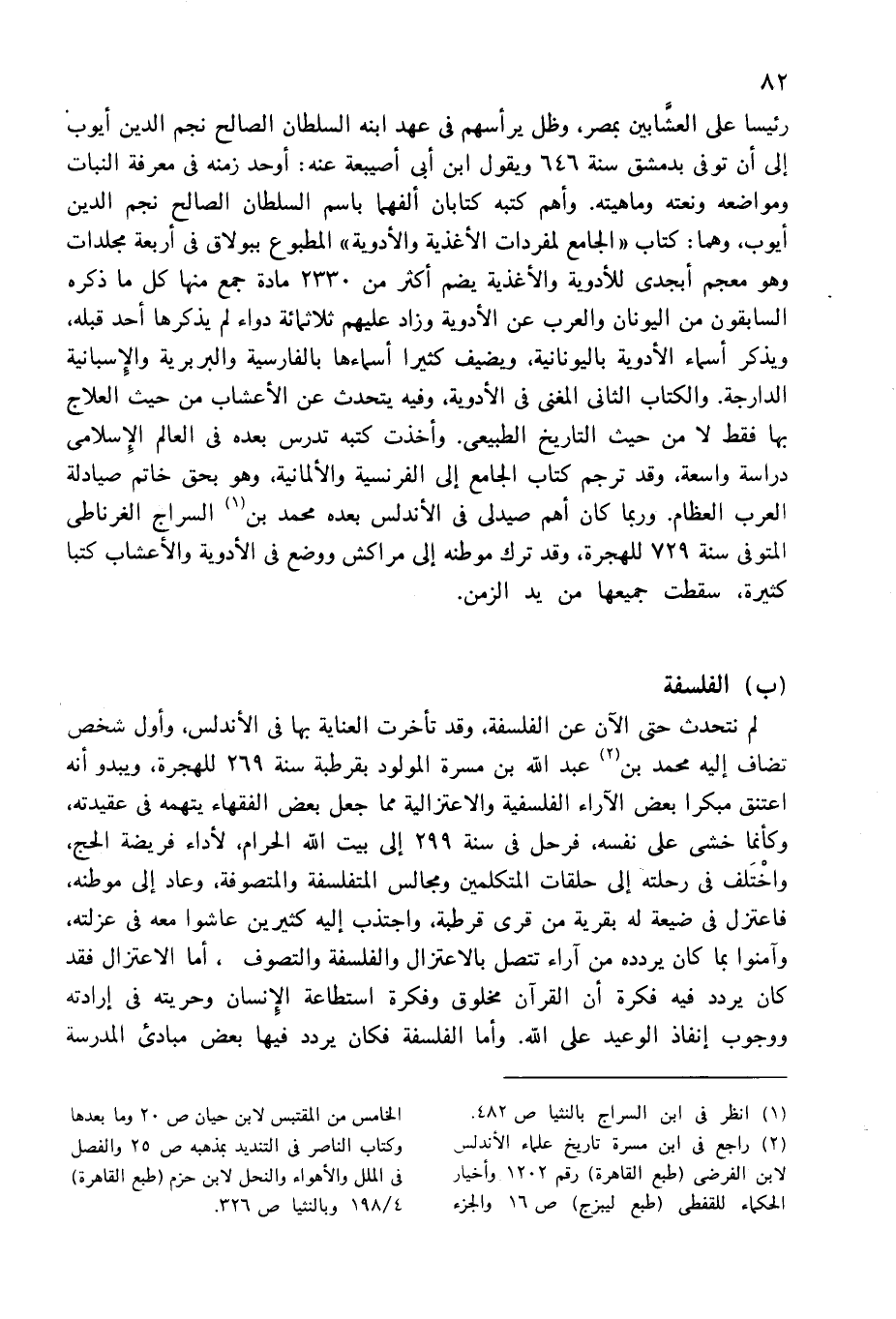 (¬2) راجع فى ابن مسرة تاريخ علماء الأندلس لابن الفرضى (طبع القاهرة) رقم 1202 وأخبار الحكماء للقفطى (طبع ليبزج) ص 16 والجزء الخامس من المقتبس لابن حيان ص 20 وما بعدها وكتاب الناصر فى التنديد بمذهبه ص 25 والفصل فى الملل والأهواء والنحل لابن حزم (طبع القاهرة) 4/ 198 وبالنثيا ص 326.