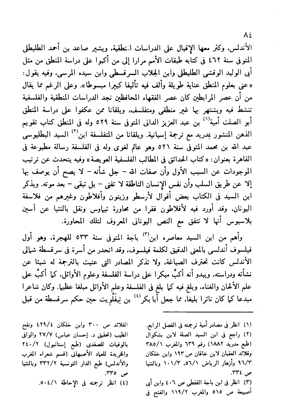 «عنى بعلوم المنطق عناية طويلة وألف فيه تأليفا كبيرا مبسوطا». وعلى الرغم مما يقال من أن عصر المرابطين كان عصر الفقهاء المحافظين نجد الدراسات المنطقية والفلسفية تنشط فيه ويشتهر بها غير منطقى ومتفلسف، ويلقانا ممن عكفوا على دراسة المنطق أبو الصلت أمية (¬1) بن عبد العزيز الدانى المتوفى سنة 529 وله فى المنطق كتاب تقويم الذهن المنشور بمدريد مع ترجمة إسبانية. ويلقانا من المتفلسفة ابن (¬2) السيد البطليوسى عبد الله بن محمد المتوفى سنة 521 وهو عالم لغوى وله فى الفلسفة رسالة مطبوعة فى القاهرة بعنوان: «كتاب الحدائق فى المطالب الفلسفية العويصة» وفيه يتحدث عن ترتيب الموجودات عن السبب الأول وأن صفات الله-جل شأنه-لا يصح أن يوصف بها إلا عن طريق السلب وأن نفس الإنسان الناطقة لا تفنى-بل تبقى-بعد موته. ويذكر ابن السيد فى الكتاب بعض أقوال لأرسطو وزينون وأفلاطون وغيرهم من فلاسفة اليونان، وقد أورد فيه لأفلاطون فقرا من محاورة تيماوس ونقل بالنثيا عن آسين بلاسيوس أنها لا تتفق مع النص اليونانى المعروف لتلك المحاورة.