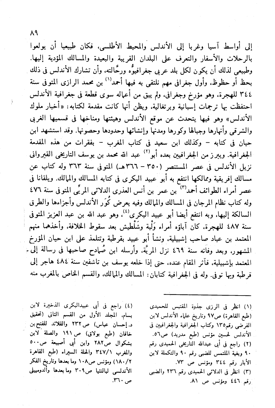 (¬1) انظر فى الرزى جذوة المقتبس للحميدى (طبع القاهرة) ص 97 وتاريخ علماء الأندلس لابن الفرضى رقم 135 وكتاب الجغرافية والجغرافيين فى الأندلس لحسين مؤنس (طبع مدريد) ص 56.