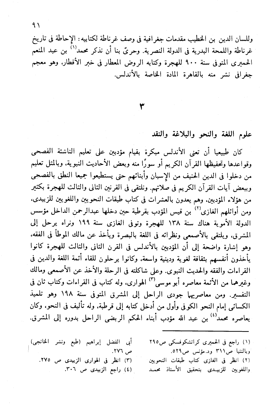 وللسان الدين بن الخطيب مقدمات جغرافية فى وصف غرناطة لكتابيه: الإحاطة فى تاريخ غرناطة واللمحة البدرية فى الدولة النصرية. وحرىّ بنا أن نذكر محمد (¬1) بن عبد المنعم الحميرى المتوفى سنة 900 للهجرة وكتابه الروض المعطار فى خبر الأقطار، وهو معجم جغرافى نشر منه بالقاهرة المادة الخاصة بالأندلس.