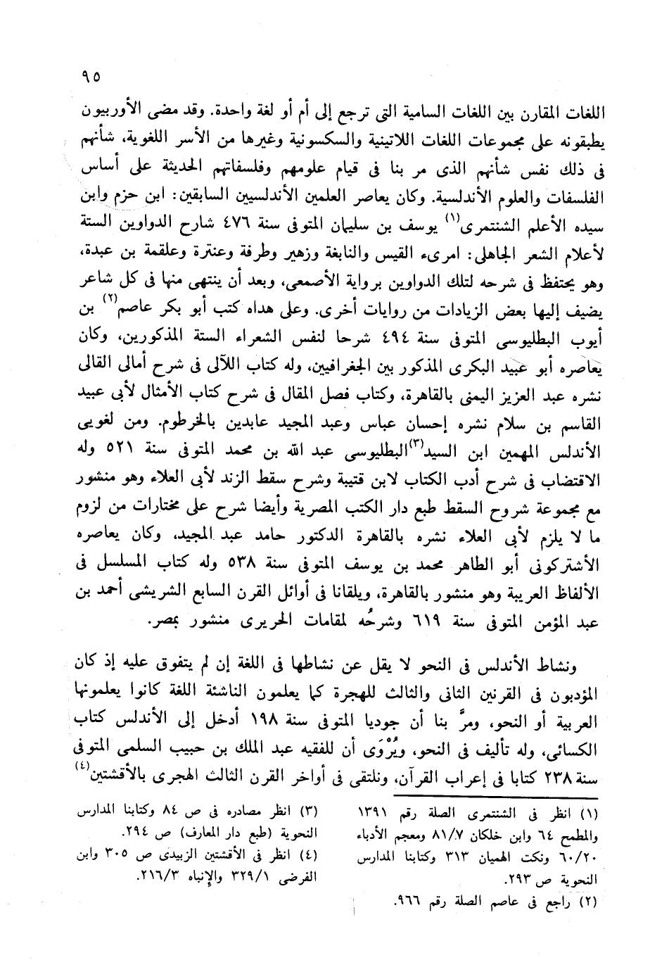 اللغات المقارن بين اللغات السامية التى ترجع إلى أم أو لغة واحدة. وقد مضى الأوربيون يطبقونه على مجموعات اللغات اللاتينية والسكسونية وغيرها من الأسر اللغوية، شأنهم فى ذلك نفس شأنهم الذى مر بنا فى قيام علومهم وفلسفاتهم الحديثة على أساس الفلسفات والعلوم الأندلسية. وكان يعاصر العلمين الأندلسيين السابقين: ابن حزم وابن سيده الأعلم الشنتمرى (¬1) يوسف بن سليمان المتوفى سنة 476 شارح الدواوين؟ ؟ ؟ لأعلام الشعر الجاهلى: امرئ القيس والنابغة وزهير وطرفة وعنترة وعلقمة بن عبدة، وهو يحتفظ فى شرحه لتلك الدواوين برواية الأصمعى، وبعد أن ينتهى منها فى كل شاعر يضيف إليها بعض الزيادات من روايات أخرى. وعلى هداه كتب أبو بكر عاصم (¬2) بن أيوب البطليوسى المتوفى سنة 494 شرحا لنفس الشعراء الستة المذكورين، وكان يعاصره أبو عبيد البكرى المذكور بين الجغرافيين، وله كتاب اللآلى فى شرح أمالى القالى نشره عبد العزيز اليمنى بالقاهرة، وكتاب فصل المقال فى شرح كتاب الأمثال لأبى عبيد القاسم بن سلام نشره إحسان عباس وعبد المجيد عابدين بالخرطوم. ومن لغويى الأندلس المهمين ابن السيد (¬3) البطليوسى عبد الله بن محمد المتوفى سنة 521 وله الاقتضاب فى شرح أدب الكتاب لابن قتيبة وشرح سقط الزند لأبى العلاء وهو منشور مع مجموعة شروح السقط طبع دار الكتب المصرية وأيضا شرح على مختارات من لزوم ما لا يلزم لأبى العلاء نشره بالقاهرة الدكتور حامد عبد المجيد، وكان يعاصره الأشتركونى أبو الطاهر محمد بن يوسف المتوفى سنة 538 وله كتاب المسلسل فى الألفاظ العربية وهو منشور بالقاهرة، ويلقانا فى أوائل القرن السابع الشريشى أحمد بن عبد المؤمن المتوفى سنة 619 وشرحه لمقامات الحريرى منشور بمصر.