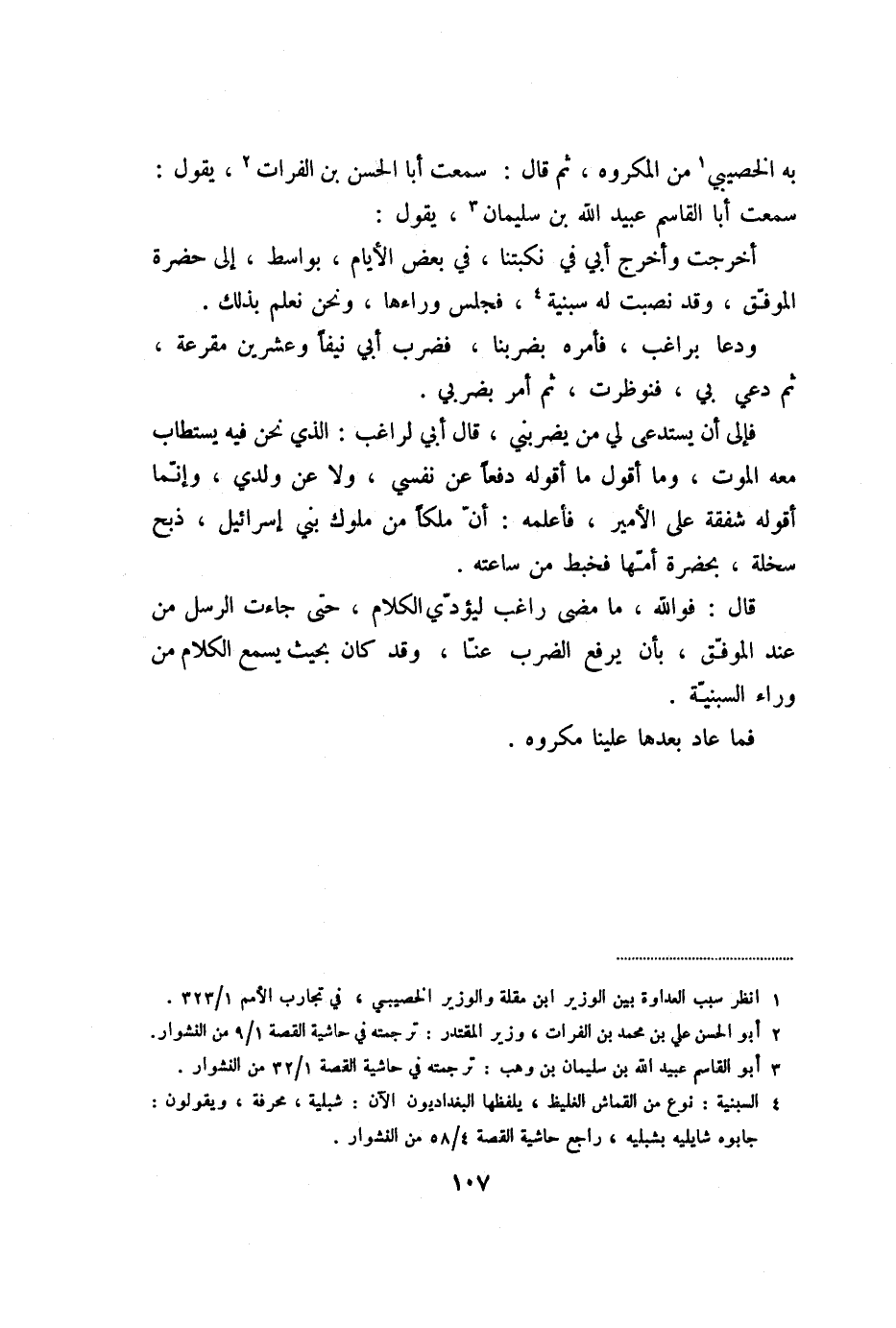 أخرجت وأخرج أبي في نكبتنا، في بعض الأيام، بواسط، إلى حضرة الموفّق، وقد نصبت له سبنية «4» ، فجلس وراءها، ونحن نعلم بذلك.