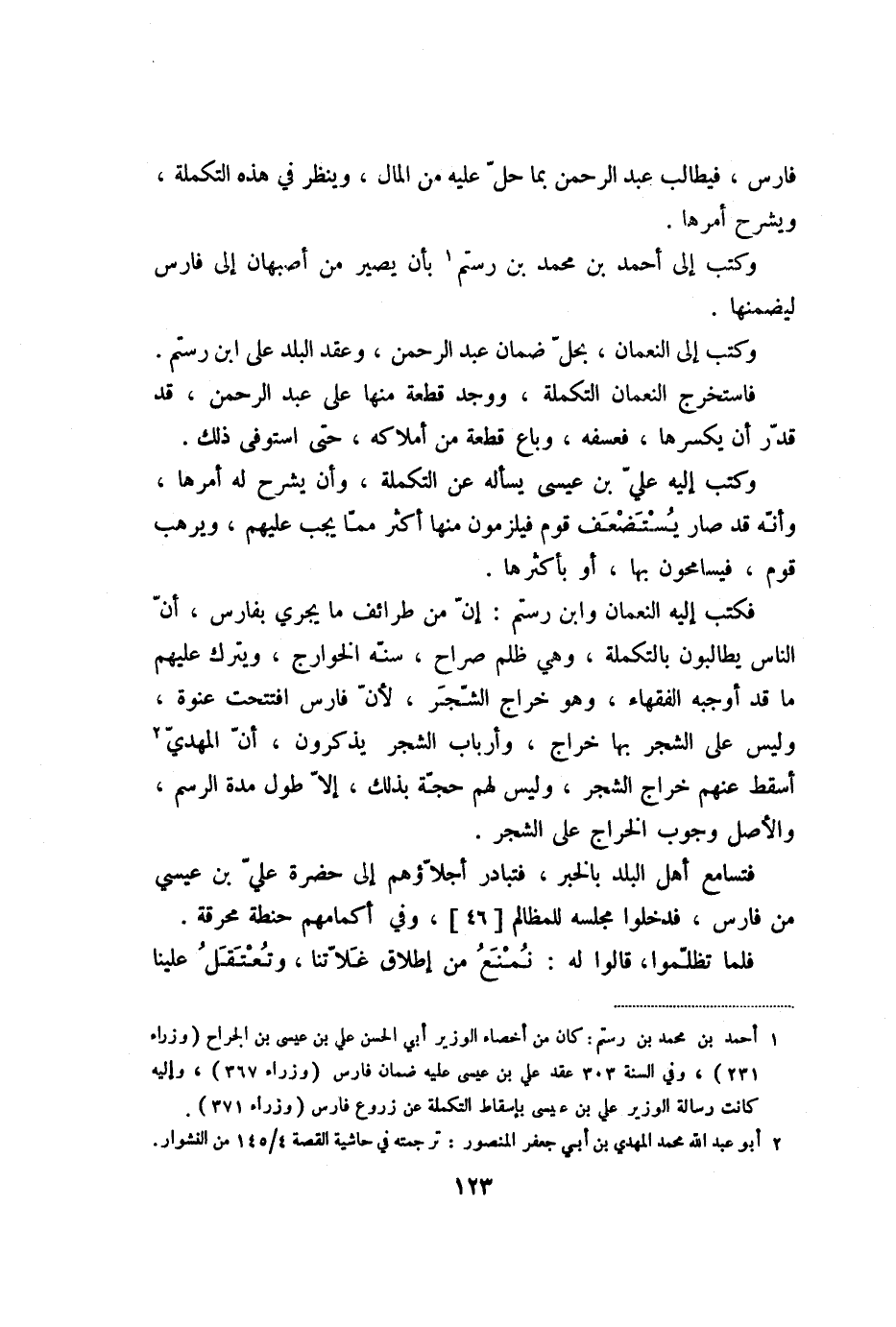 فكتب إليه النعمان وابن رستم: إنّ من طرائف ما يجري بفارس، أنّ الناس يطالبون بالتكملة، وهي ظلم صراح، سنّه الخوارج، ويترك عليهم ما قد أوجبه الفقهاء، وهو خراج الشّجر، لأنّ فارس افتتحت عنوة، وليس على الشجر بها خراج، وأرباب الشجر يذكرون، أنّ المهديّ «2» أسقط عنهم خراج الشجر، وليس لهم حجّة بذلك، إلّا طول مدة الرسم، والأصل وجوب الخراج على الشجر.