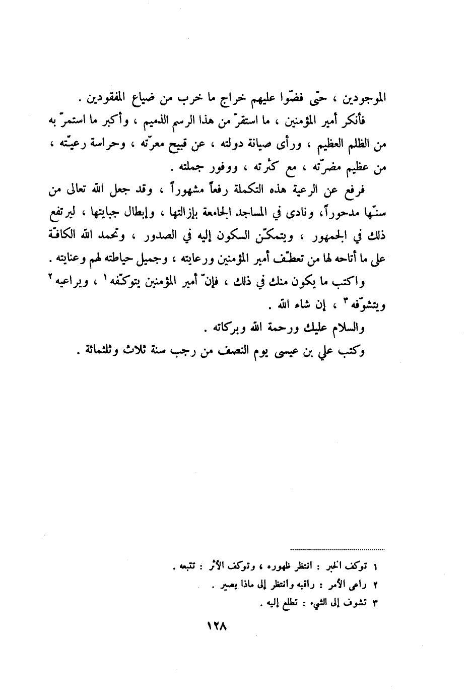 فرفع عن الرعية هذه التكملة رفعا مشهورا، وقد جعل الله تعالى من سنّها مدحورا، ونادى في المساجد الجامعة بإزالتها، وإبطال جبايتها، ليرتفع ذلك في الجمهور، ويتمكّن السكون إليه في الصدور، وتحمد الله الكافّة على ما أتاحه لها من تعطّف أمير المؤمنين ورعايته، وجميل حياطته لهم وعنايته.