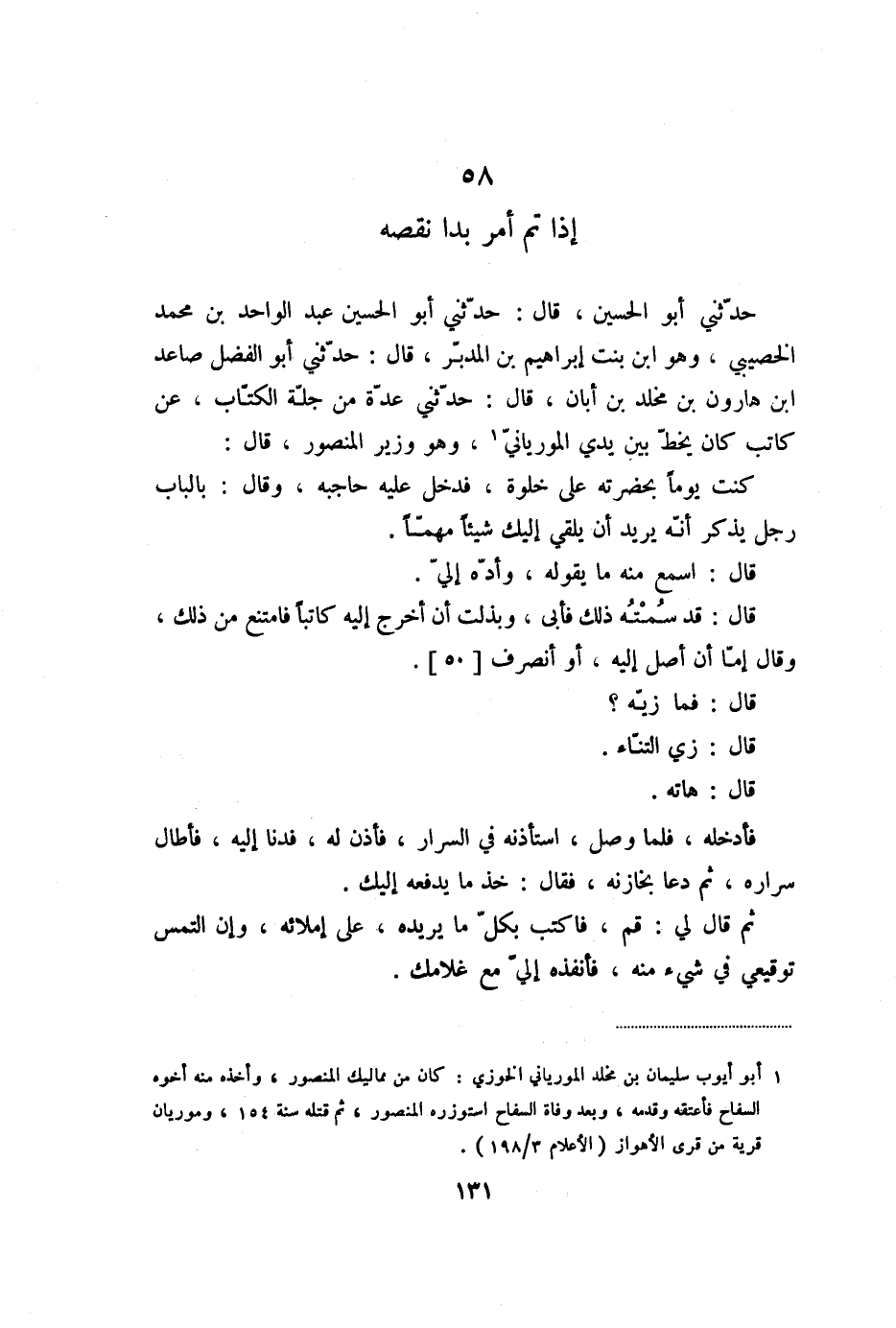 حدّثني أبو الحسين، قال: حدّثني أبو الحسين عبد الواحد بن محمد الخصيبي، وهو ابن بنت إبراهيم بن المدبّر، قال: حدّثني أبو الفضل صاعد ابن هارون بن مخلد بن أبان، قال: حدّثني عدّة من جلّة الكتّاب، عن كاتب كان يخطّ بين يدي الموريانيّ «1» ، وهو وزير المنصور، قال: