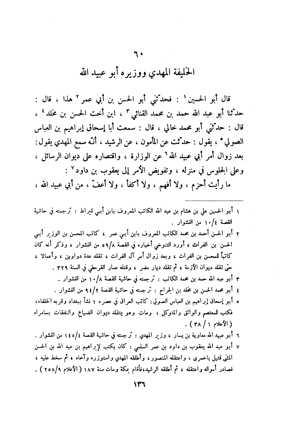 حدّثنا أبو عبد الله حمد بن محمد القنائي «3» ، ابن أخت الحسن بن مخلد «4» ، قال: حدّثني أبو محمد خالي، قال: سمعت أبا إسحاق إبراهيم بن العباس الصولي «5» ، يقول: حدّثت عن المأمون، عن الرشيد، أنّه سمع المهدي يقول: