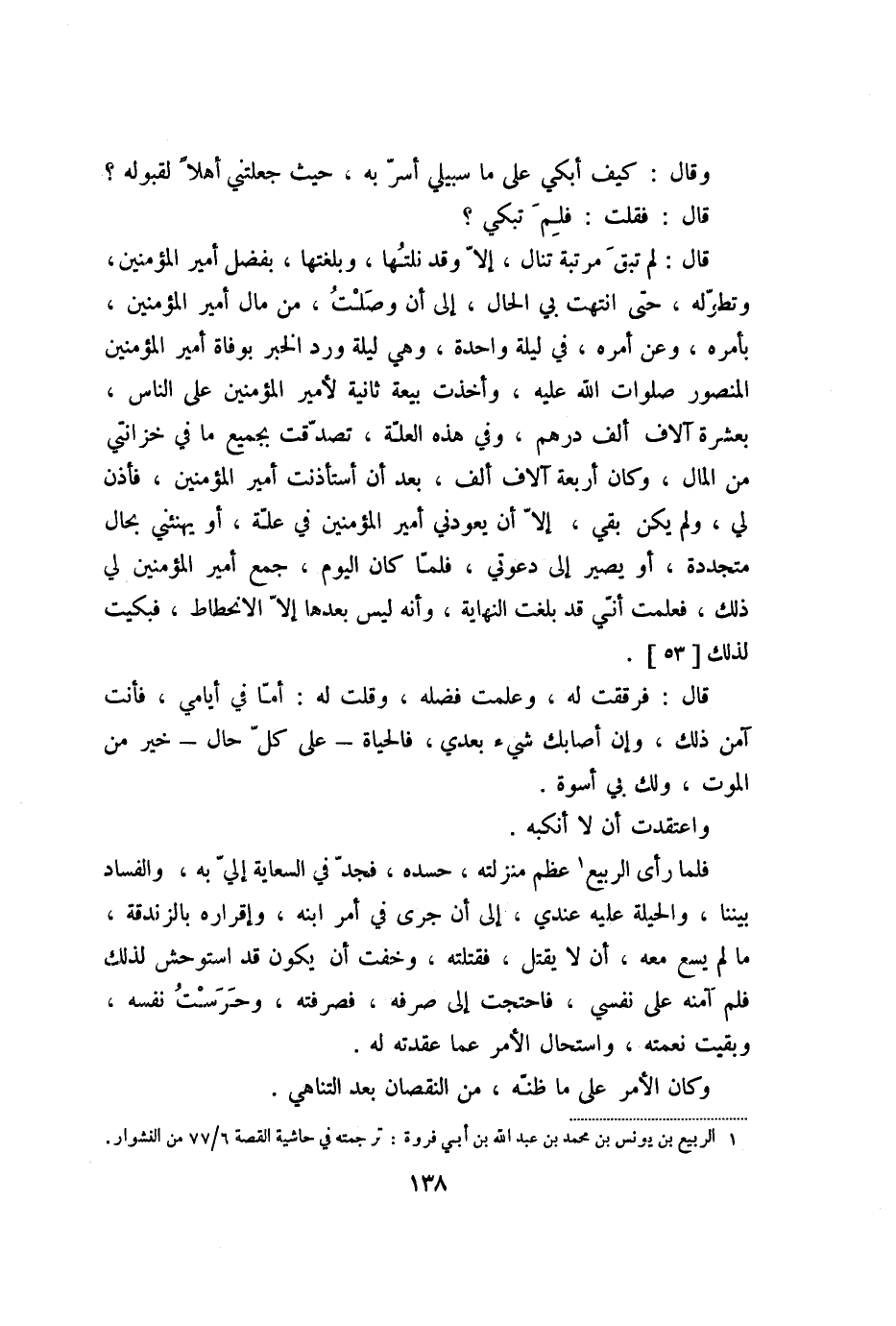 قال: لم تبق مرتبة تنال، إلّا وقد نلتها، وبلغتها، بفضل أمير المؤمنين، وتطوّله، حتى انتهت بي الحال، إلى أن وصلت، من مال أمير المؤمنين، بأمره، وعن أمره، في ليلة واحدة، وهي ليلة ورد الخبر بوفاة أمير المؤمنين المنصور صلوات الله عليه، وأخذت بيعة ثانية لأمير المؤمنين على الناس، بعشرة آلاف ألف درهم، وفي هذه العلّة، تصدّقت بجميع ما في خزانتي من المال، وكان أربعة آلاف ألف، بعد أن أستأذنت أمير المؤمنين، فأذن لي، ولم يكن بقي، إلّا أن يعودني أمير المؤمنين في علّة، أو يهنئني بحال مسجددة، أو يصير إلى دعوتي، فلمّا كان اليوم، جمع أمير المؤمنين لي ذلك، فعلمت أنّي قد بلغت النهاية، وأنه ليس بعدها إلّا الانحطاط، فبكيت لذلك [53] .