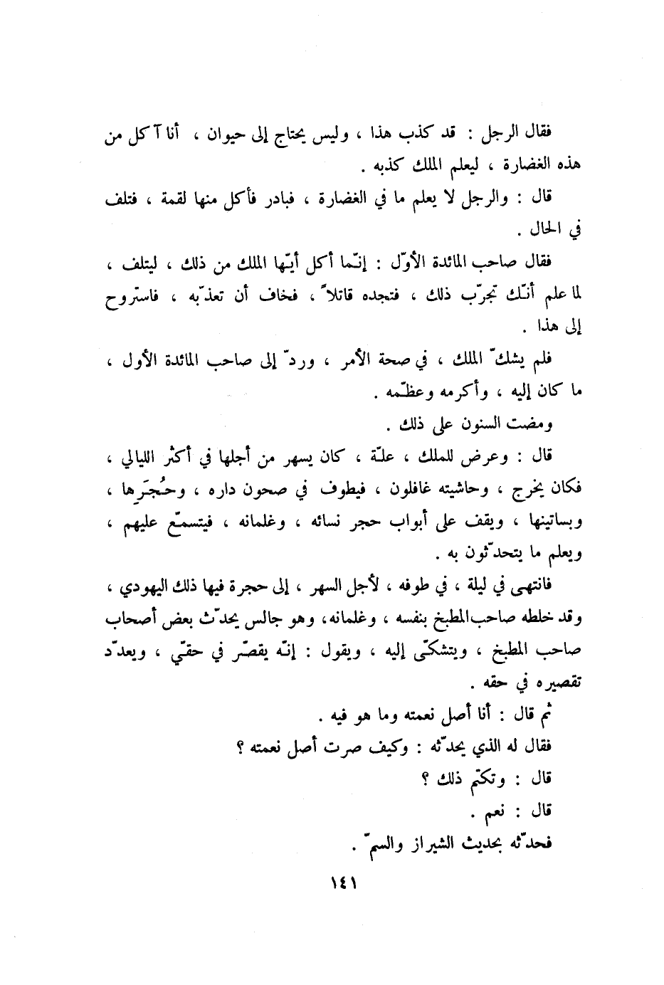 فقال صاحب المائدة الأوّل: إنّما أكل أيّها الملك من ذلك، ليتلف، لما علم أنّك تجرّب ذلك، فتجده قاتلا، فخاف أن تعذّبه، فاستروح إلى هذا.