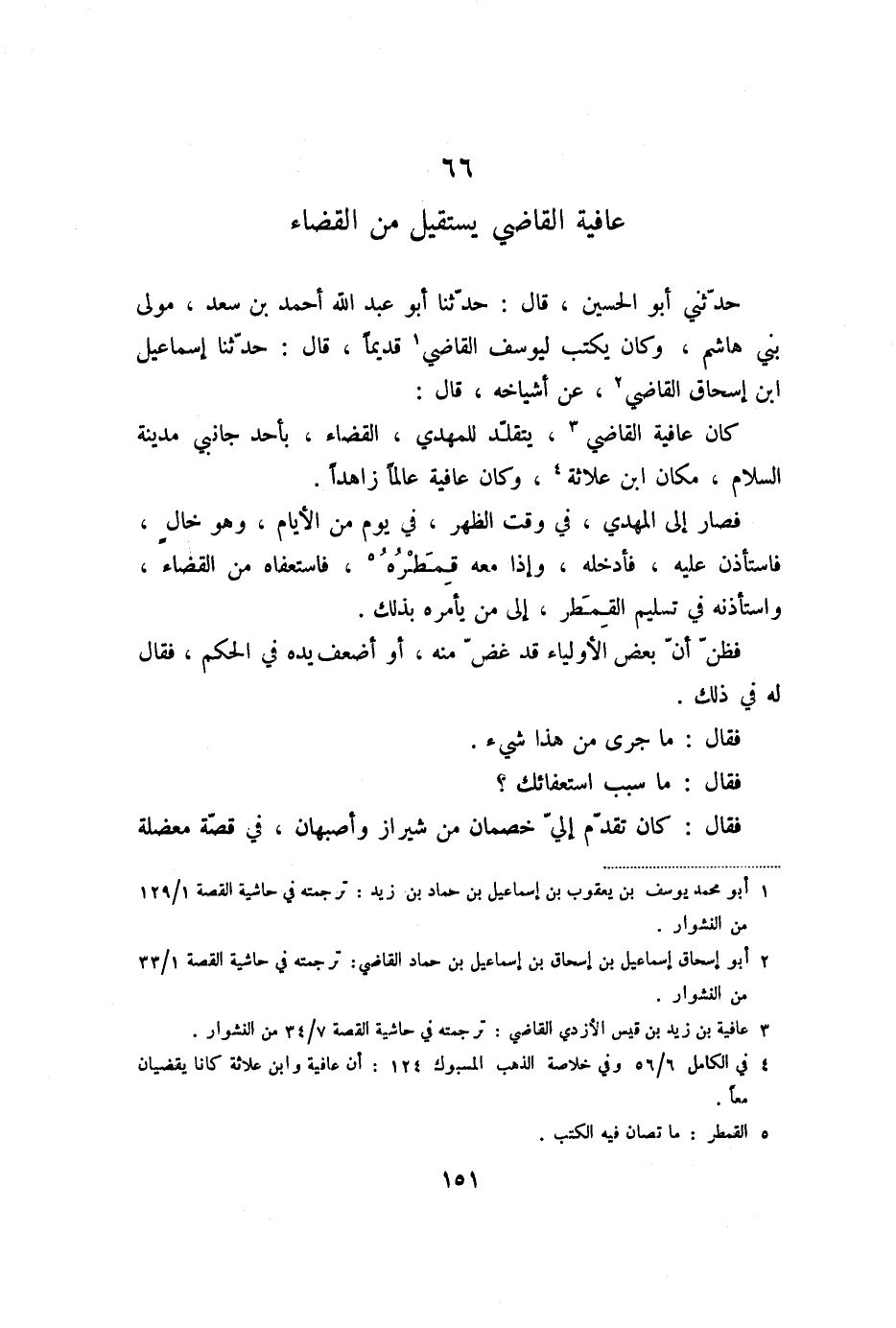 كان عافية القاضي «3» ، يتقلّد للمهدي، القضاء، بأحد جانبي مدينة السلام، مكان ابن علاثة «4» ، وكان عافية عالما زاهدا.