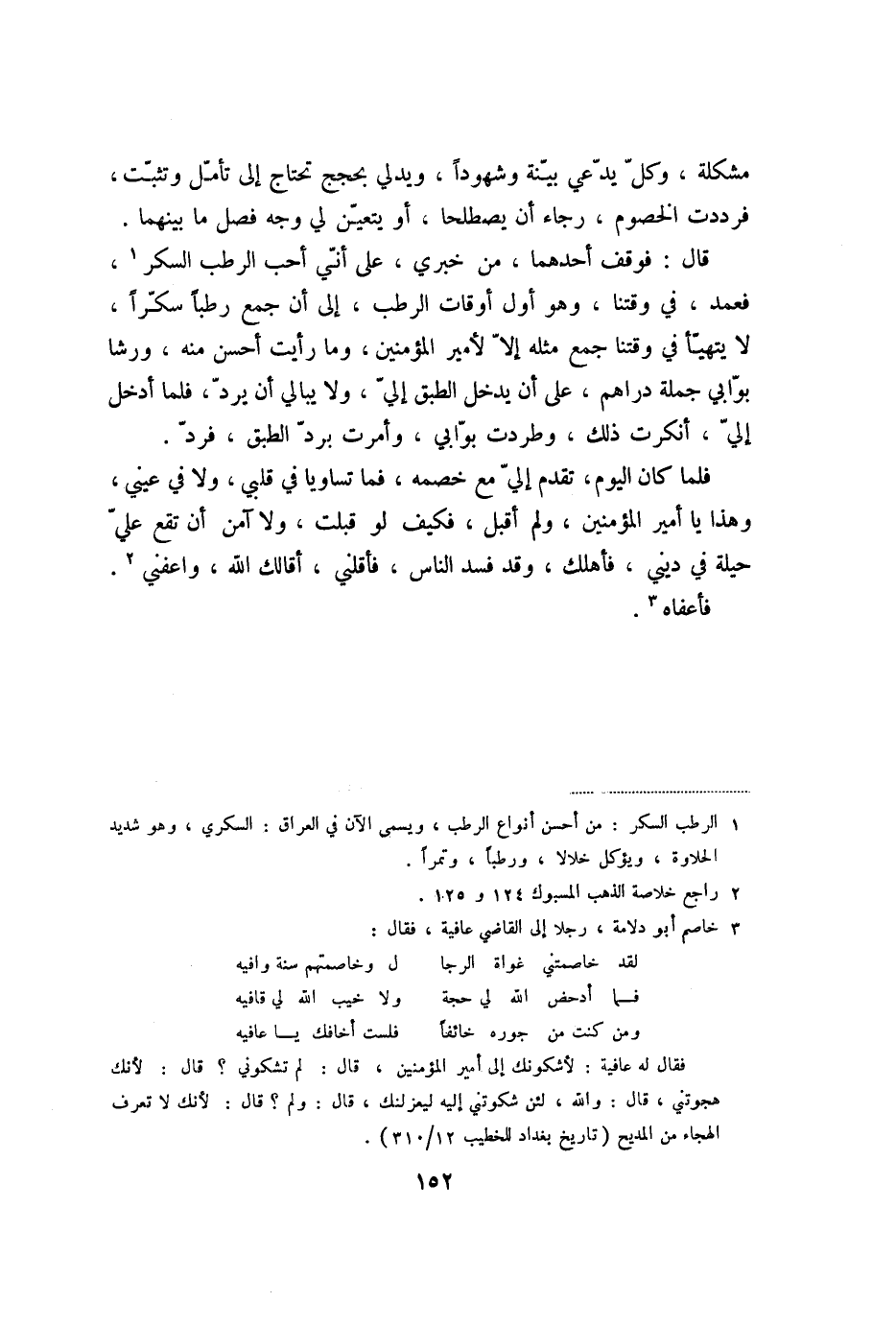 قال: فوقف أحدهما، من خبري، على أنّي أحب الرطب السكر «1» ، فعمد، في وقتنا، وهو أول أوقات الرطب، إلى أن جمع رطبا سكّرا، لا يتهيّأ في وقتنا جمع مثله إلّا لأمير المؤمنين، وما رأيت أحسن منه، ورشا بوّابي جملة دراهم، على أن يدخل الطبق إليّ، ولا يبالي أن يردّ، فلما أدخل إليّ، أنكرت ذلك، وطردت بوّابي، وأمرت بردّ الطبق، فردّ.