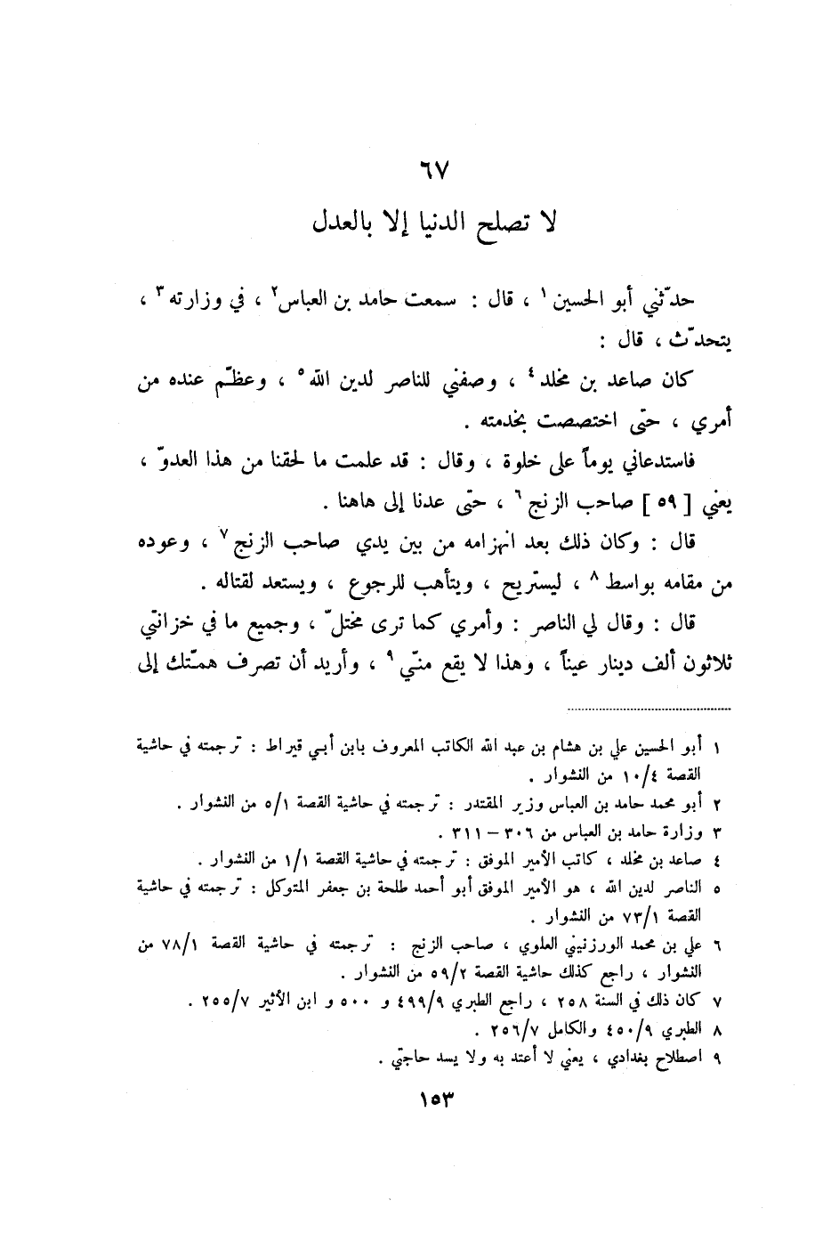 فاستدعاني يوما على خلوة، وقال: قد علمت ما لحقنا من هذا العدوّ، يعني [59] صاحب الزنج «6» ، حتى عدنا إلى هاهنا.