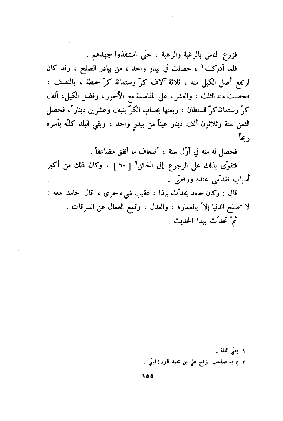 فلما أدركت «1» ، حصلت في بيدر واحد، من بيادر الصلح، وقد كان ارتفع أصل الكيل منه، ثلاثة آلاف كرّ وستمائة كرّ حنطة، بالنصف، فحصلت منه الثلث، والعشر، على المقاسمة مع الأجور، وفضل الكيل، ألف كرّ وستمائة كرّ للسلطان، وبعتها بحساب الكرّ بنيف وعشرين دينارا، فحصل الثمن ستة وثلاثون ألف دينار عينا من بيدر واحد، وبقي البلد كلّه بأسره ربحا.