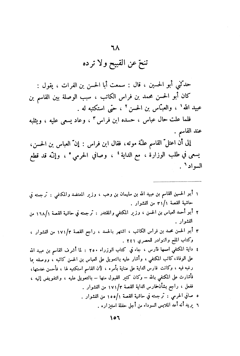 إلى أن اعتلّ القاسم علّة موته، فقال ابن فراس: إنّ العباس بن الحسن، يسعى في طلب الوزارة، مع الداية «4» ، وصافي الحرمي «5» ، وإنّه قد قطع السواد «6» .