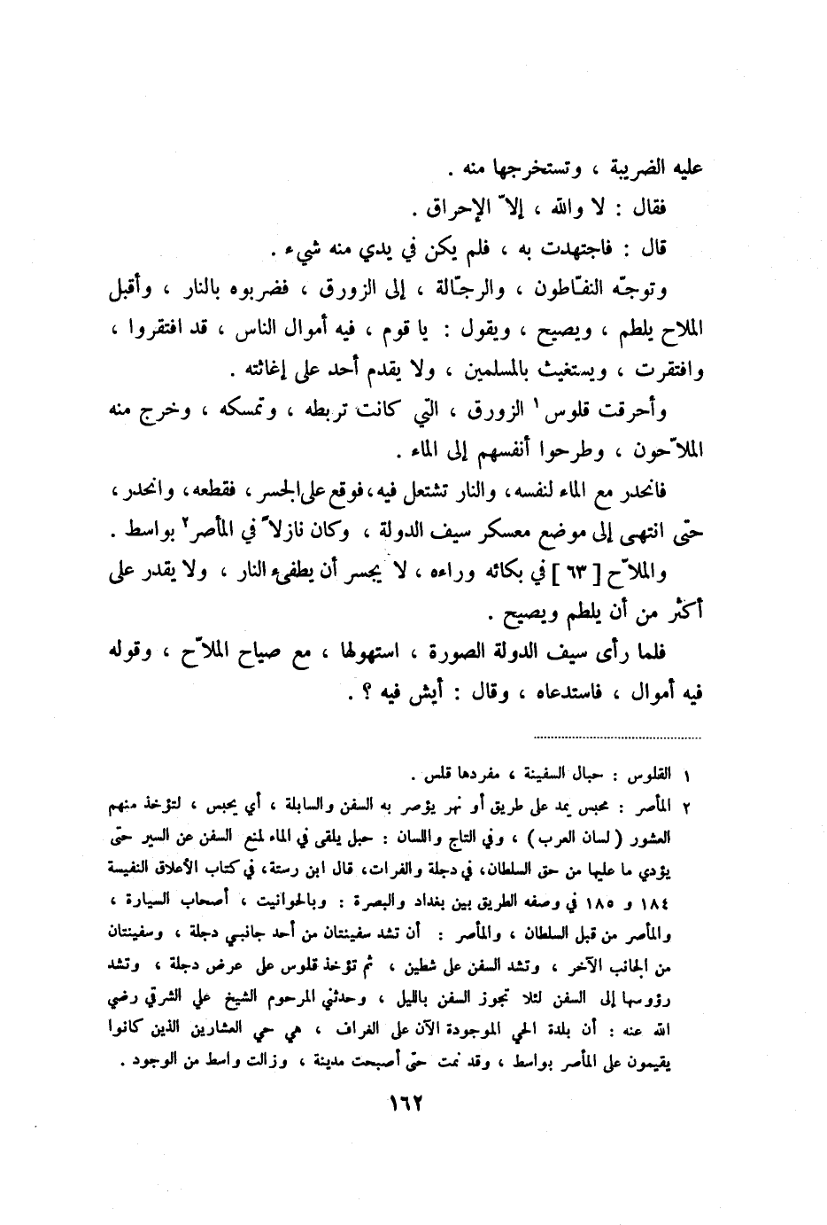 وأحرقت قلوس «1» الزورق، التي كانت تربطه، وتمسكه، وخرج منه الملّاحون، وطرحوا أنفسهم إلى الماء.