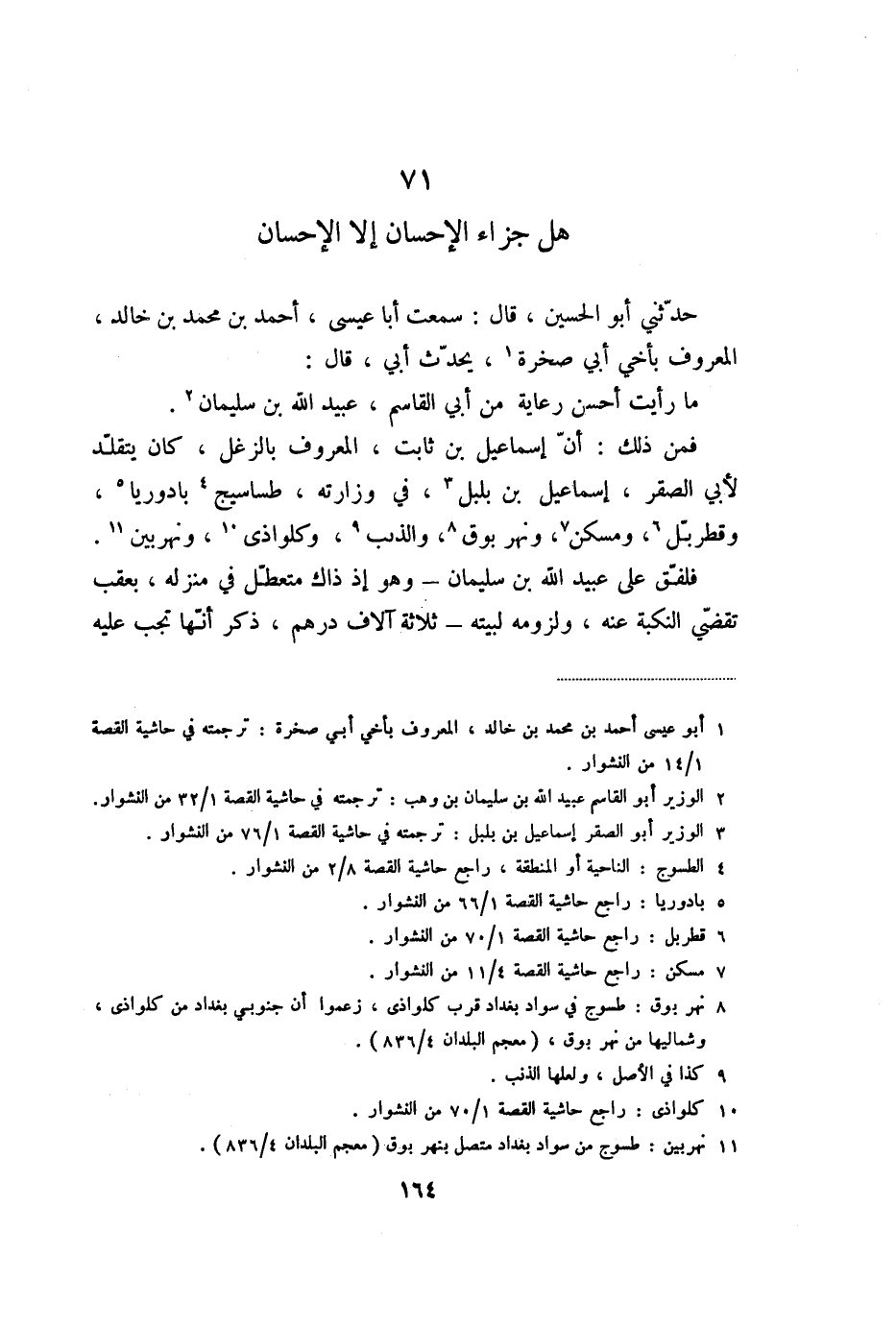 فمن ذلك: أنّ إسماعيل بن ثابت، المعروف بالزغل، كان يتقلّد لأبي الصقر، إسماعيل بن بلبل «3» ، في وزارته، طساسيج «4» بادوريا «5» ، وقطربّل «6» ، ومسكن «7» ، ونهر بوق «8» ، والذئب؟؟؟ «9» ، وكلواذى «10» ، ونهربين «11» .