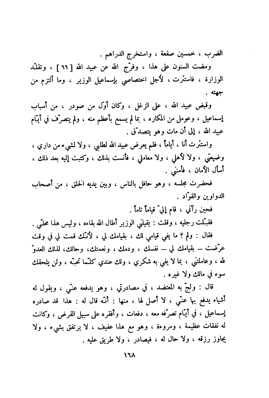 قال: ولجّ به المعتضد، في مصادرتي، وهو يدفعه عنّي، ويقول له أشياء يدفع بها عنّي، لا أصل لها، منها: أنّه قال له: هذا قد صادره إسماعيل، في أيّام تصرّفه معه، دفعات، وأفقره على سبيل القرض، وكانت له نفقات عظيمة، ومروءة، وهو مع هذا عفيف، لا يرتفق بشيء، ولا يجاوز رزقه، ولا حال له، فيصادر، ولا طريق عليه.