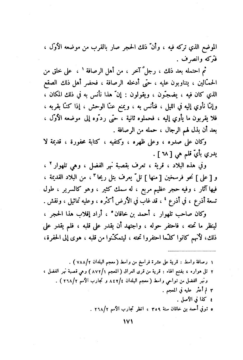 وكان صاحب تلهوار، أحمد بن خاقان «5» ، أراد إقلاب هذا الحجر، لينظر ما تحته، فاحتفر حوله، واجتهد أن يقدر على قلبه، فلم يقدر على ذلك، لأنهم كانوا كلّما احتفروا تحته، ليتمكّنوا من قلبه، هوى إلى الحفرة،
