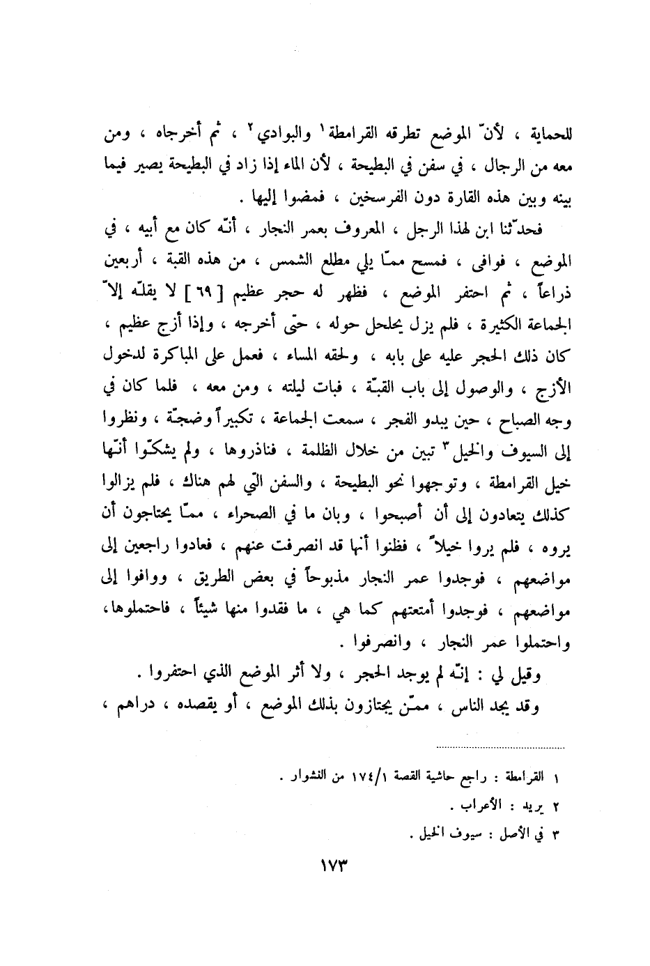 فحدّثنا ابن لهذا الرجل، المعروف بعمر النجار، أنّه كان مع أبيه، في الموضع، فوافى، فمسح ممّا يلي مطلع الشمس، من هذه القبة، أربعين ذراعا، ثم احتفر الموضع، فظهر له حجر عظيم [69] لا يقلّه إلّا الجماعة الكثيرة، فلم يزل يحلحل حوله، حتى أخرجه، وإذا أزج عظيم، كان ذلك الحجر عليه على بابه، ولحقه المساء، فعمل على المباكرة لدخول الأزج، والوصول إلى باب القبّة، فبات ليلته، ومن معه، فلما كان في وجه الصباح، حين يبدو الفجر، سمعت الجماعة، تكبيرا وضجّة، ونظروا إلى السيوف والخيل «3» تبين من خلال الظلمة، فناذروها، ولم يشكّوا أنّها خيل القرامطة، وتوجهوا نحو البطيحة، والسفن التي لهم هناك، فلم يزالوا كذلك يتعادون إلى أن أصبحوا، وبان ما في الصحراء، ممّا يحتاجون أن يروه، فلم يروا خيلا، فظنوا أنّها قد انصرفت عنهم، فعادوا راجعين إلى مواضعهم، فوجدوا عمر النجار مذبوحا في بعض الطريق، ووافوا إلى مواضعهم، فوجدوا أمتعتهم كما هي، ما فقدوا منها شيئا، فاحتملوها، واحتملوا عمر النجار، وانصرفوا.