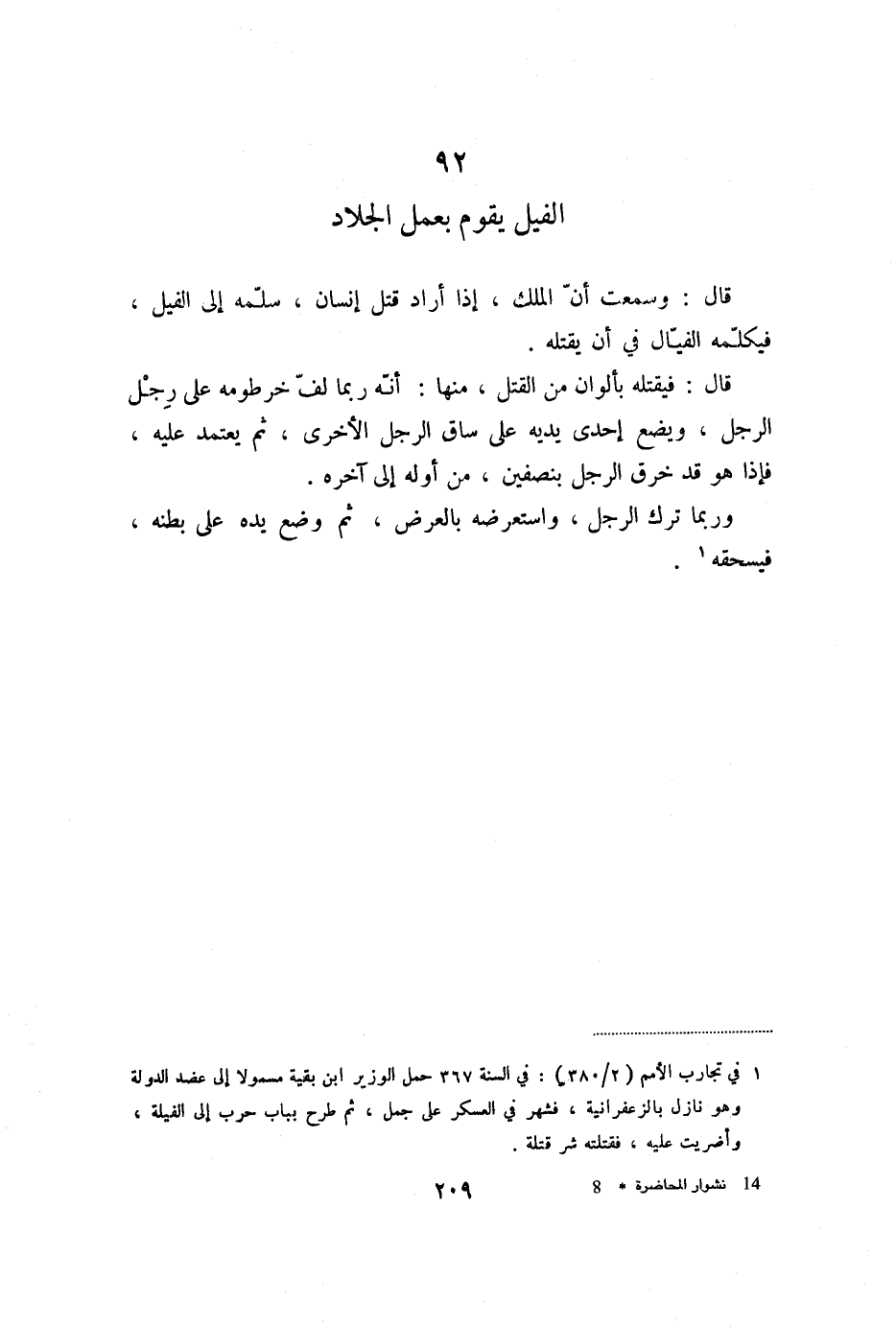 قال: وسمعت أنّ الملك، إذا أراد قتل إنسان، سلّمه إلى الفيل، فيكلّمه الفيّال في أن يقتله.