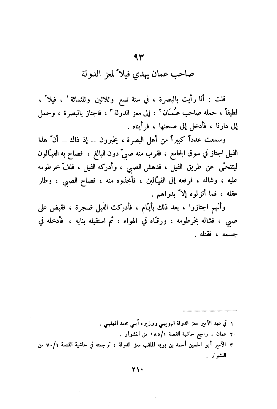 وسمعت عددا كبيرا من أهل البصرة، يخبرون- إذ ذاك- أنّ هذا الفيل اجتاز في سوق الجامع، فقرب منه صبيّ دون البالغ، فصاح به الفيّالون ليتنحّى عن طريق الفيل، فدهش الصبي، وأدركه الفيل، فلفّ خرطومه عليه، وشاله، فرفعه إلى الفيّالين، فأخذوه منه، فصاح الصبي، وطار عقله، فما أنزلوه إلّا بدراهم.