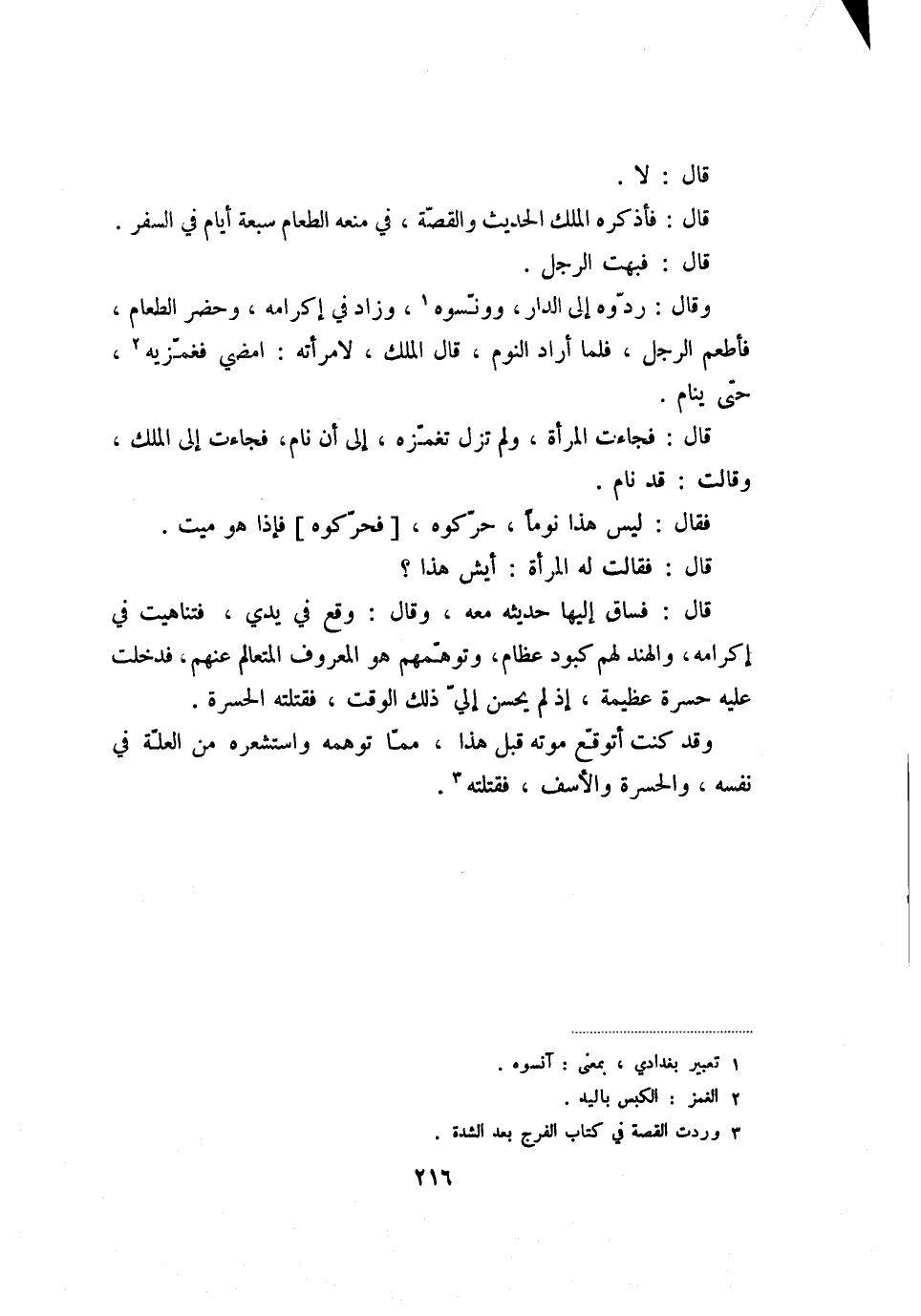 وقال: ردّوه إلى الدار، وونّسوه «1» ، وزاد في إكرامه، وحضر الطعام، فأطعم الرجل، فلما أراد النوم، قال الملك، لامرأته: امضي فغمّزيه «2» ، حتى ينام.