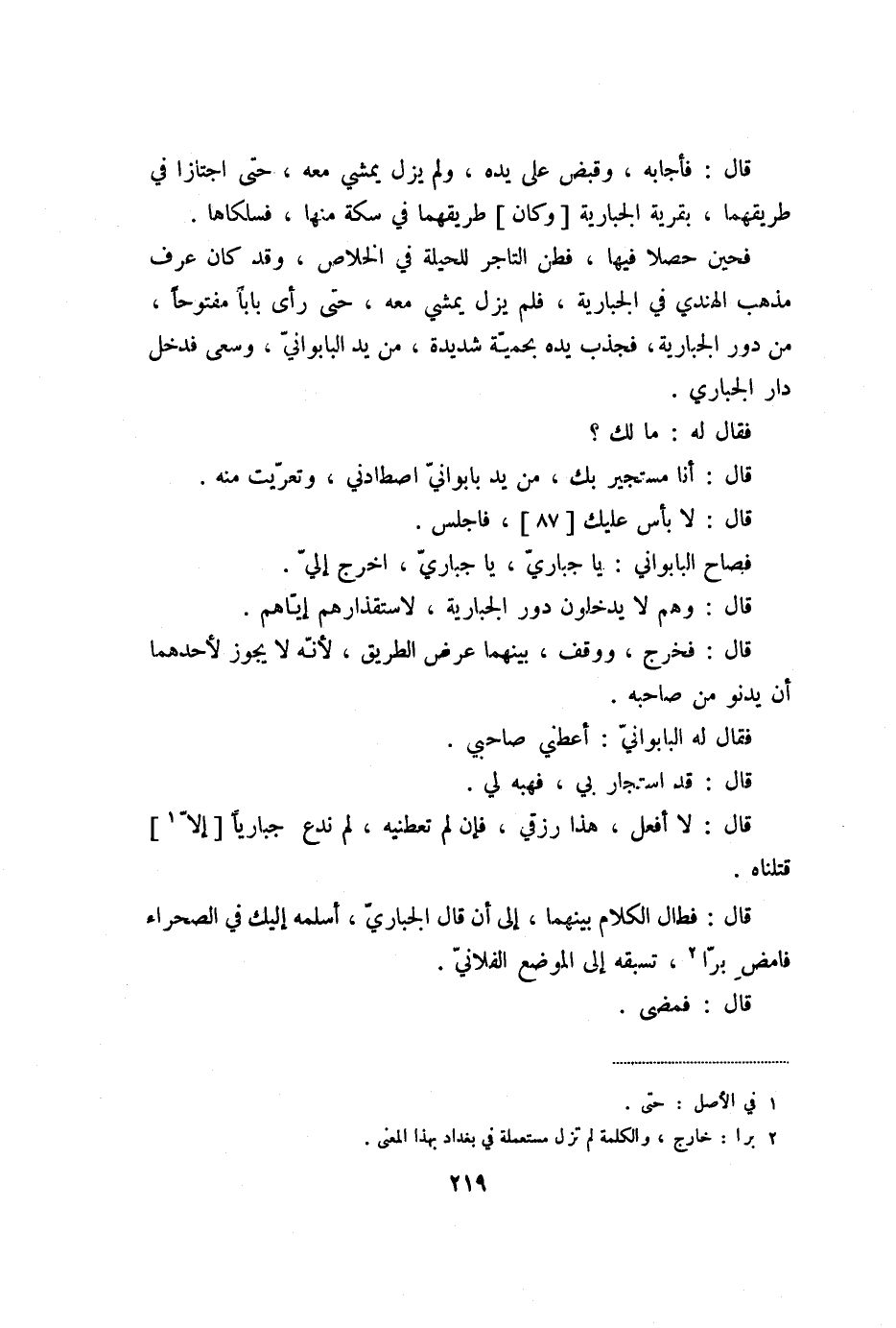 قال: فطال الكلام بينهما، إلى أن قال الجباريّ، أسلمه إليك في الصحراء فامض برّا «2» ، تسبقه إلى الموضع الفلانيّ.