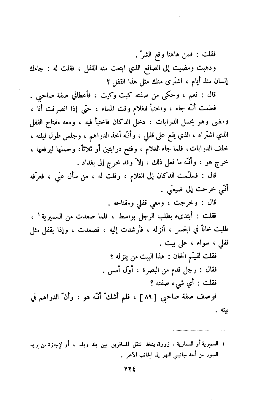 فعلمت أنّه جاء، واختبأ للغلام وقت المساء، حتى إذا انصرفت أنا، ومضى وهو يحمل الدرابات، دخل الدكان فاختبأ فيه، ومعه مفتاح القفل الذي اشتراه، الذي يقع على قفلي، وأنّه أخذ الدراهم، وجلس طول ليلته، خلف الدرابات، فلما جاء الغلام، وفتح درابتين أو ثلاثا، وحملها ليرفعها، خرج هو، وأنّه ما فعل ذلك، إلّا وقد خرج إلى بغداد.