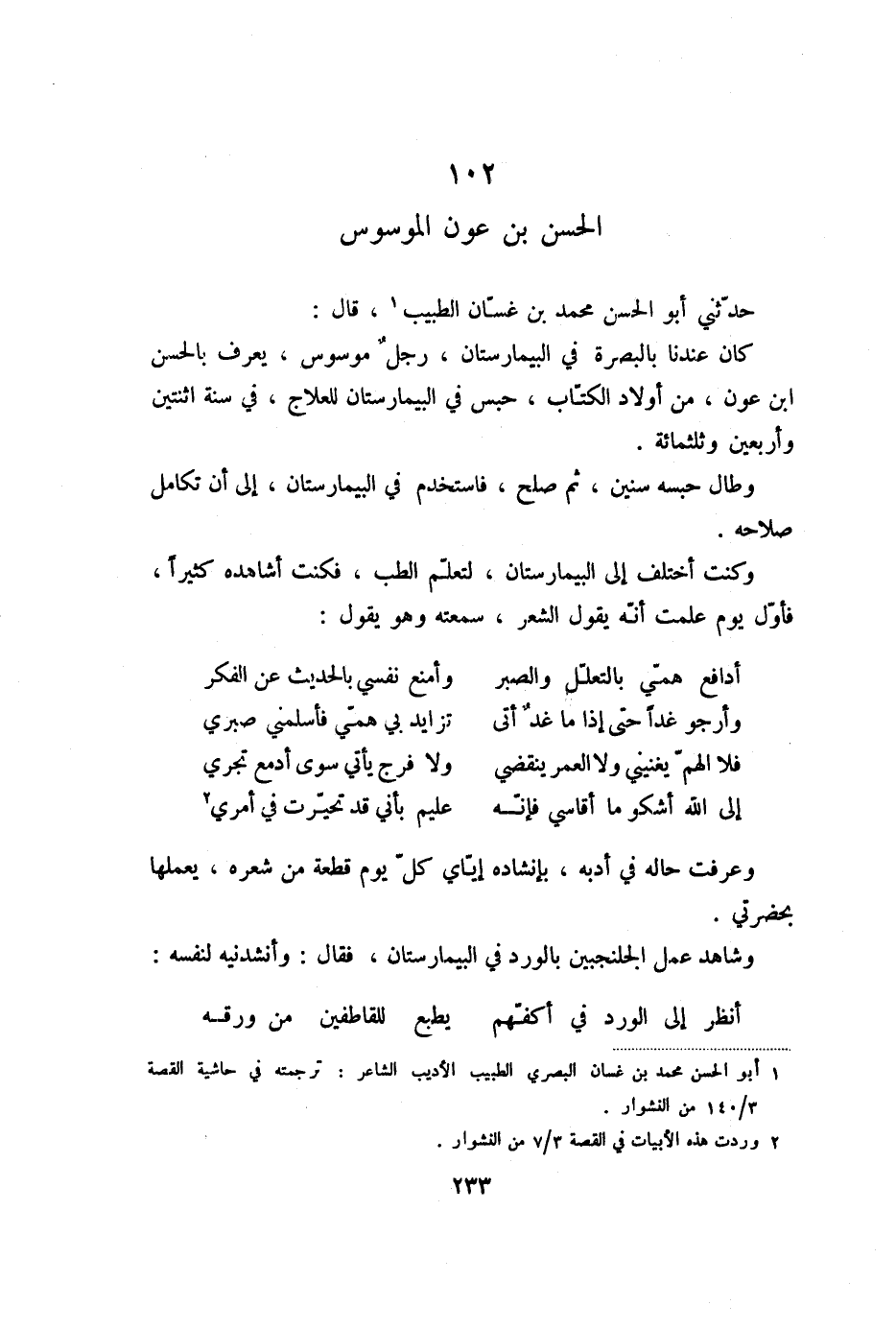 كان عندنا بالبصرة في البيمارستان، رجل موسوس، يعرف بالحسن ابن عون، من أولاد الكتّاب، حبس في البيمارستان للعلاج، في سنة اثنتين وأربعين وثلاثمائة.