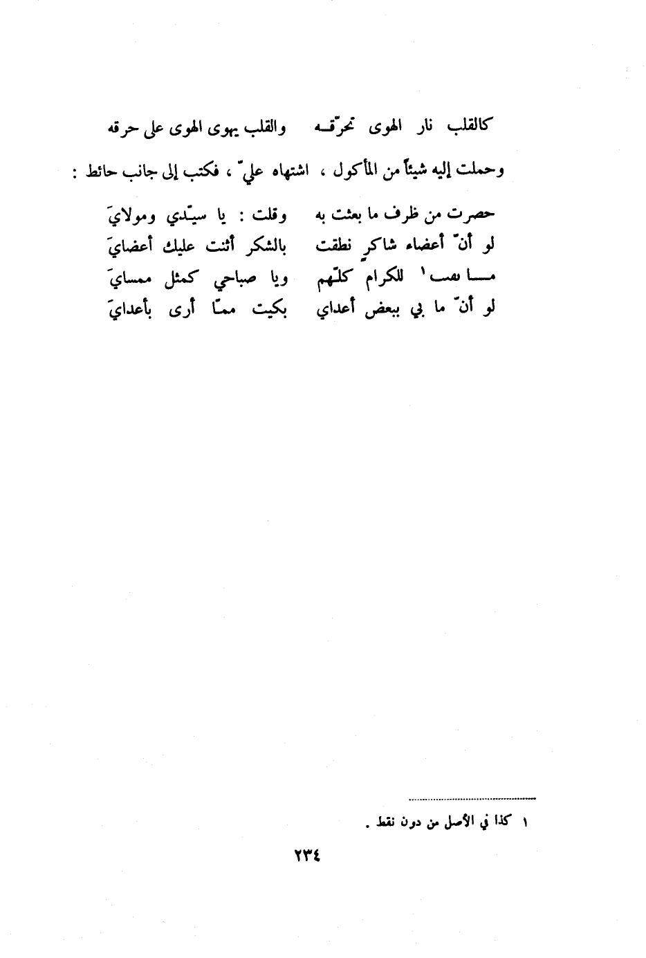 وحملت إليه شيئا من المأكول، اشتهاه عليّ، فكتب إلى جانب حائط: